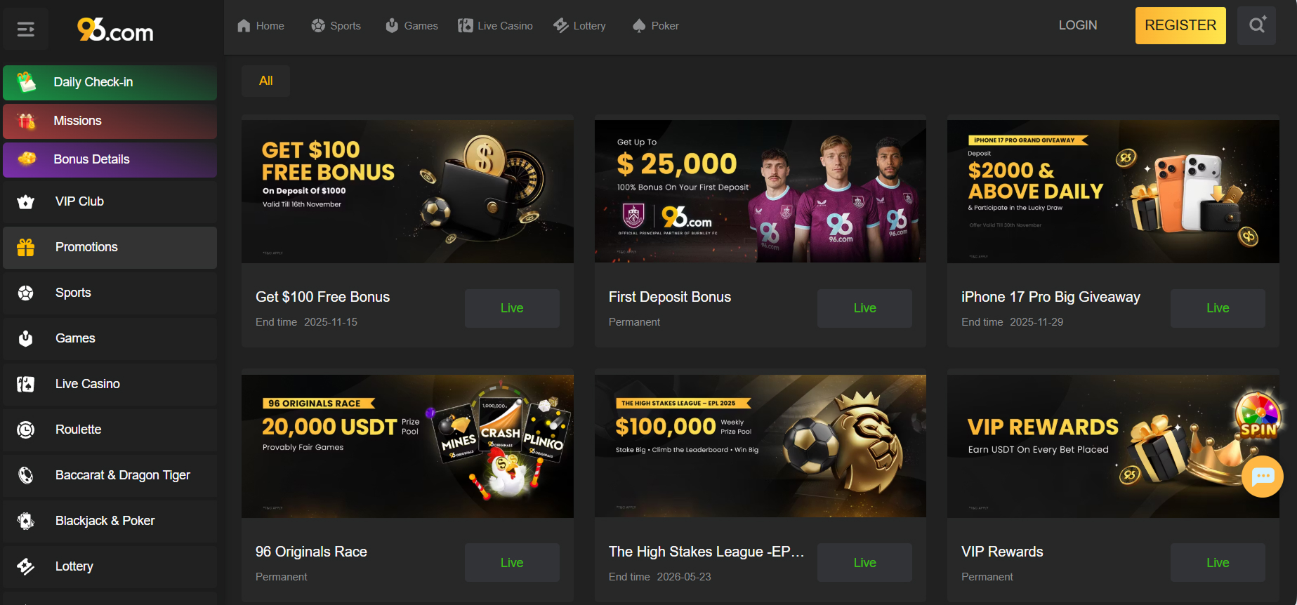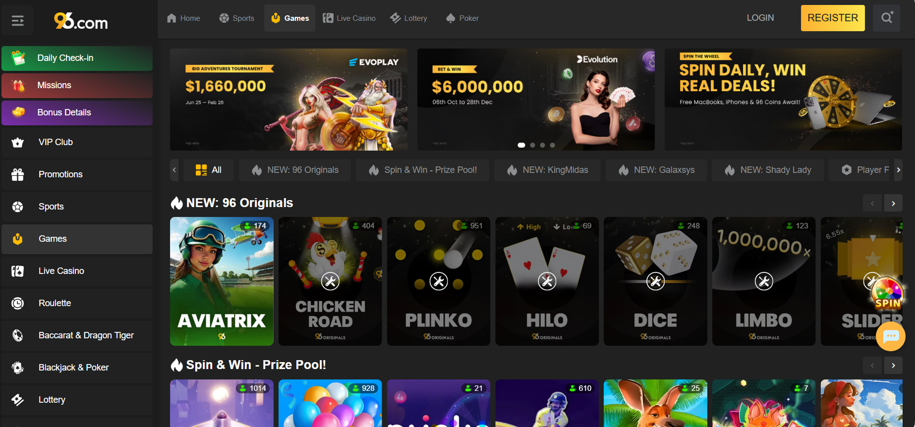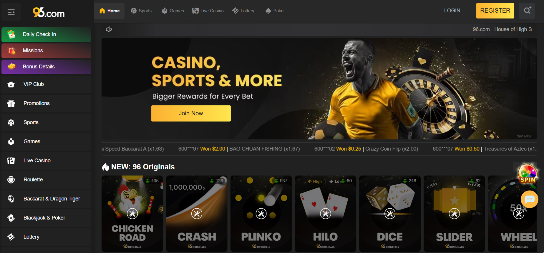 96.com Casino is a multifaceted online gaming platform that brings together an extensive library of titles, strong security measures, and reliable transactions. The site features thousands of games, including a massive collection of slot machines, classic table games such as blackjack, roulette, and poker, as well as a fully developed live casino section. It also offers “96 Originals,” a set of in-house games built with provably fair technology, allowing players to verify the integrity of outcomes. This wide selection caters to both casual players and those seeking more strategic gameplay.