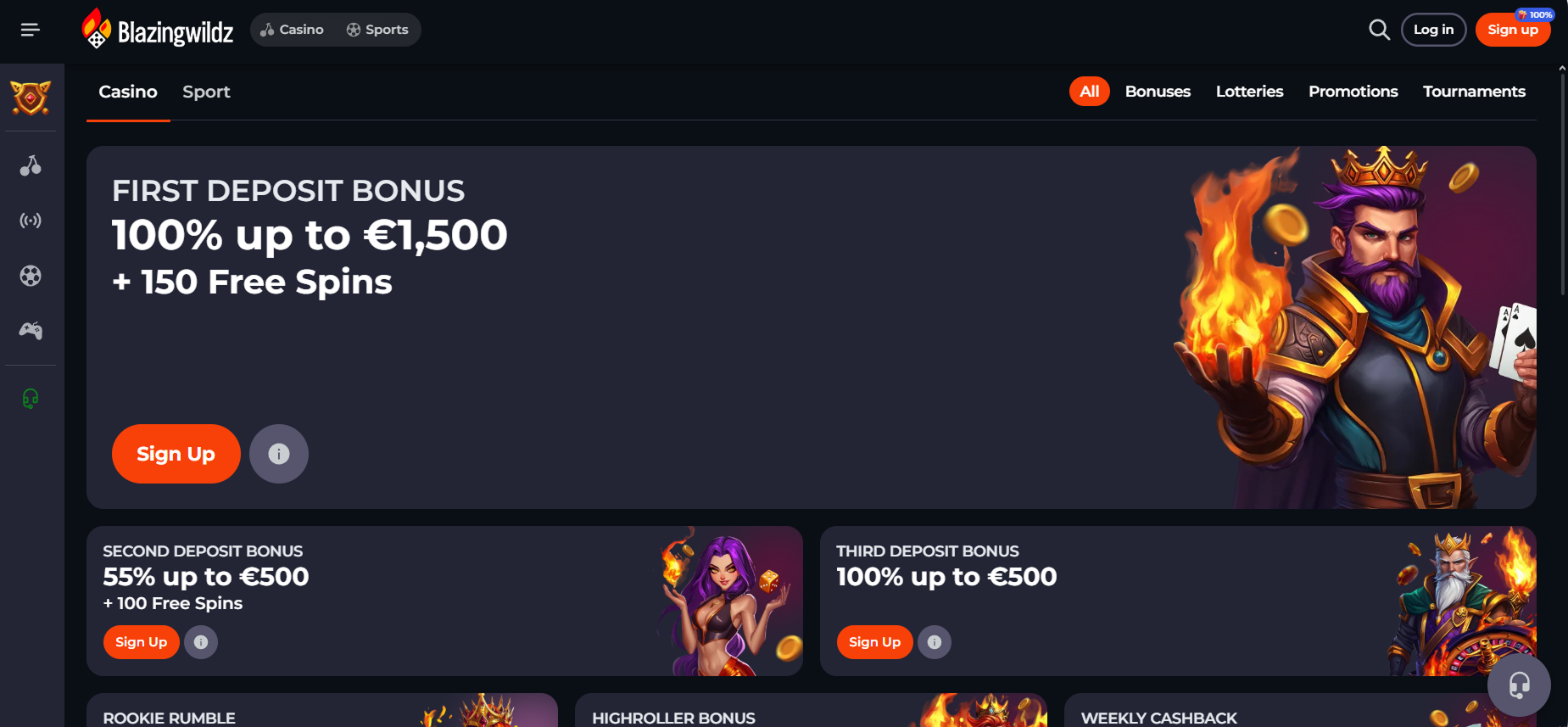 The welcome bonus at BlazingWildz Casino is structured as a tiered package for new players. On your first deposit you can claim a 100% match bonus up to €1,500 along with 150 free spins. Subsequent deposits are eligible for further bonus funds, and the total free spins in the welcome bundle can reach 250 in some versions of the offer.