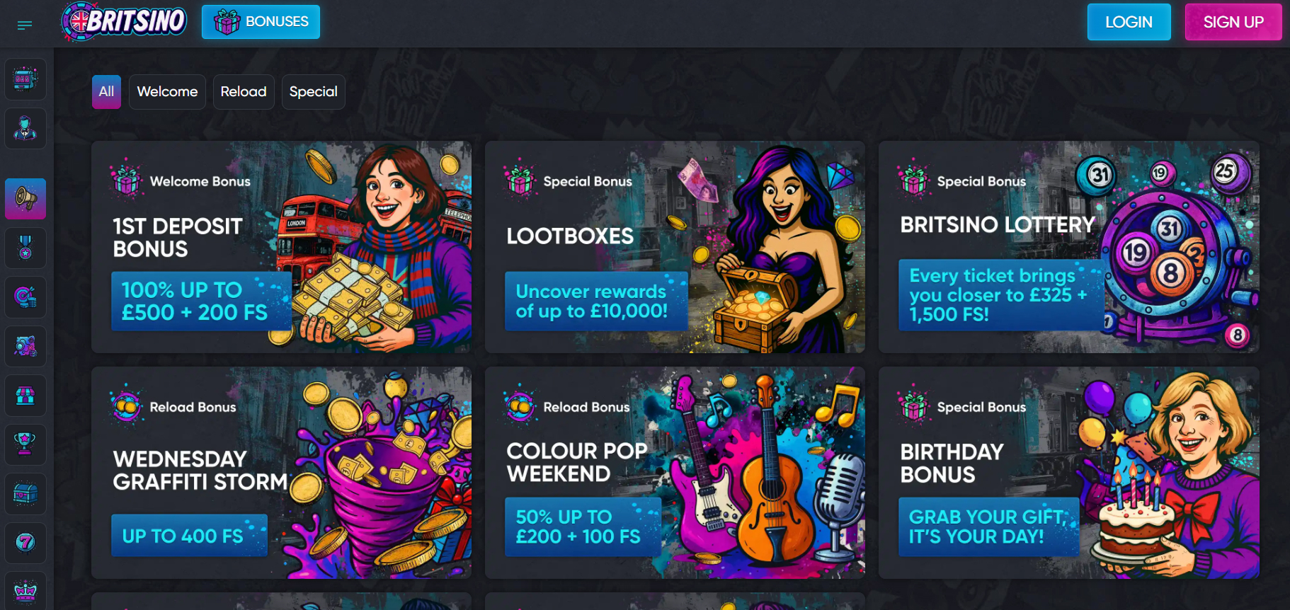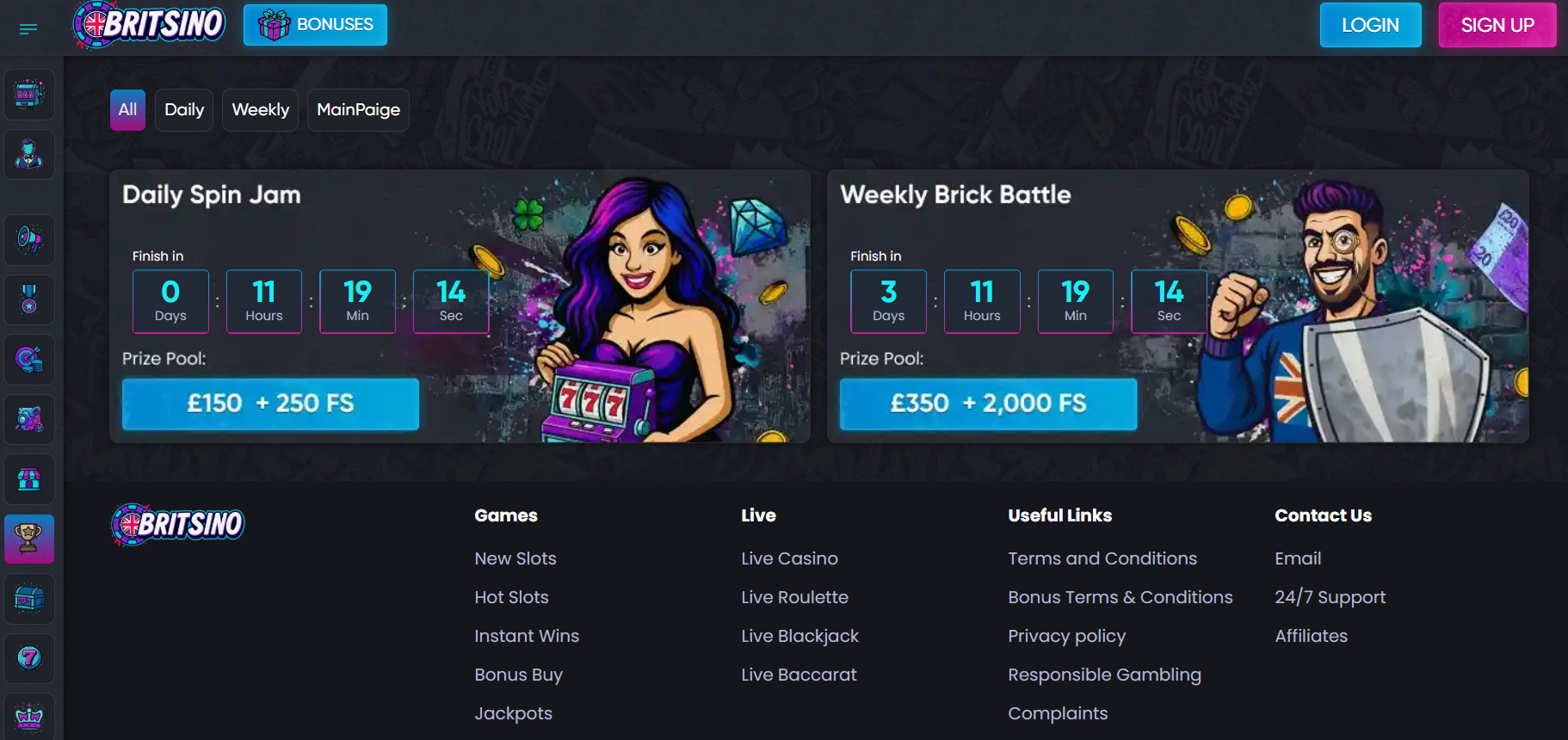Britsino Casino offers a wide range of promotions to keep players engaged and rewarded. New members can claim a four-tier welcome package worth up to £2,200 plus 800 free spins. Regular players can benefit from weekly reload bonuses, tournaments with cash prizes, a gamified lootbox system tied to deposit tiers, and a lottery for extra rewards. Additionally, the five-level VIP program provides exclusive perks, higher withdrawal limits, and personalized bonuses to loyal players.