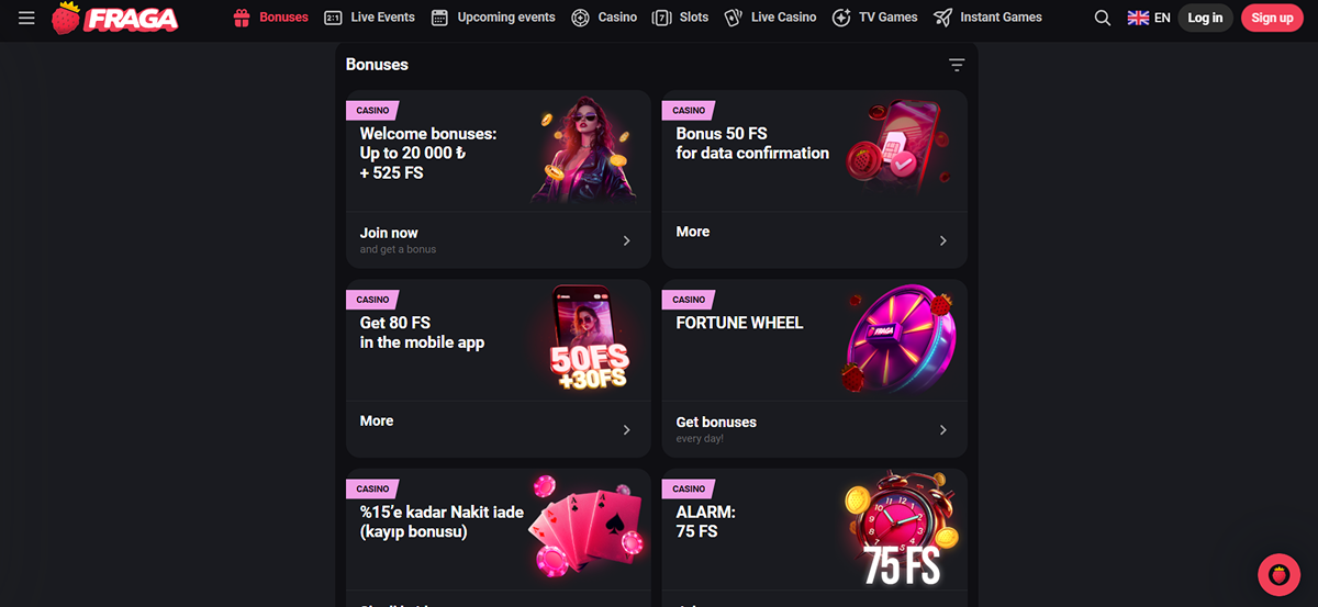 Fragabet Casino offers a diverse range of casino bonuses designed to appeal to both new and existing players. New users can access a welcome package that includes a deposit-based bonus of up to 20,000 ₺ along with up to 525 free spins, typically distributed across initial deposits. Additional free spin offers are available for completing basic account actions, such as data confirmation, and for using the mobile platform, where players may receive extra spins. Ongoing promotions include a daily Fortune Wheel that provides random rewards, as well as a cashback offer of up to 15% on losses, credited under specific conditions. Weekly campaigns are structured around set days, such as free spins on Mondays, bonus offers on Wednesdays, Fridays, and weekends, and themed promotions like “4 Elements.” The casino also highlights a premium-style program and a cryptocurrency-related bonus that adds an extra percentage to eligible crypto deposits, all subject to standard bonus terms and wagering requirements.