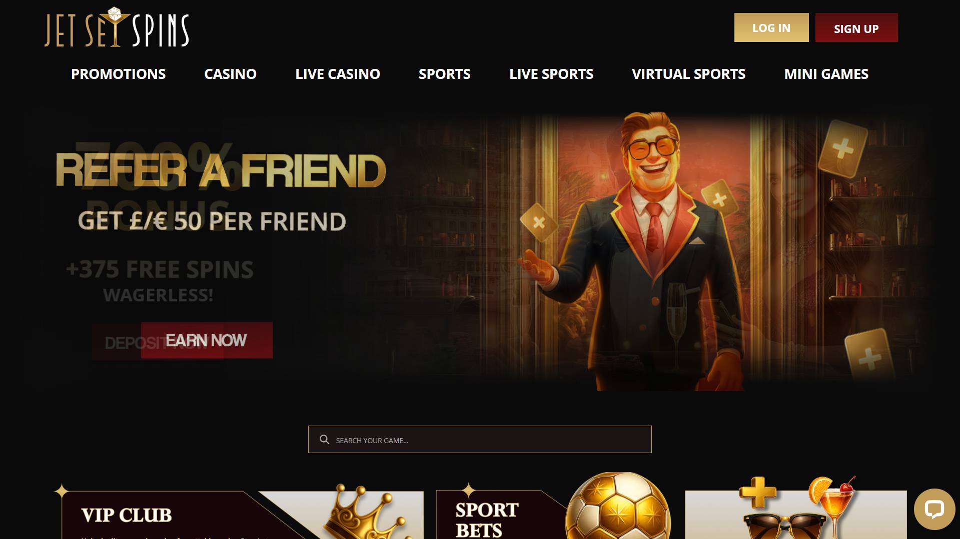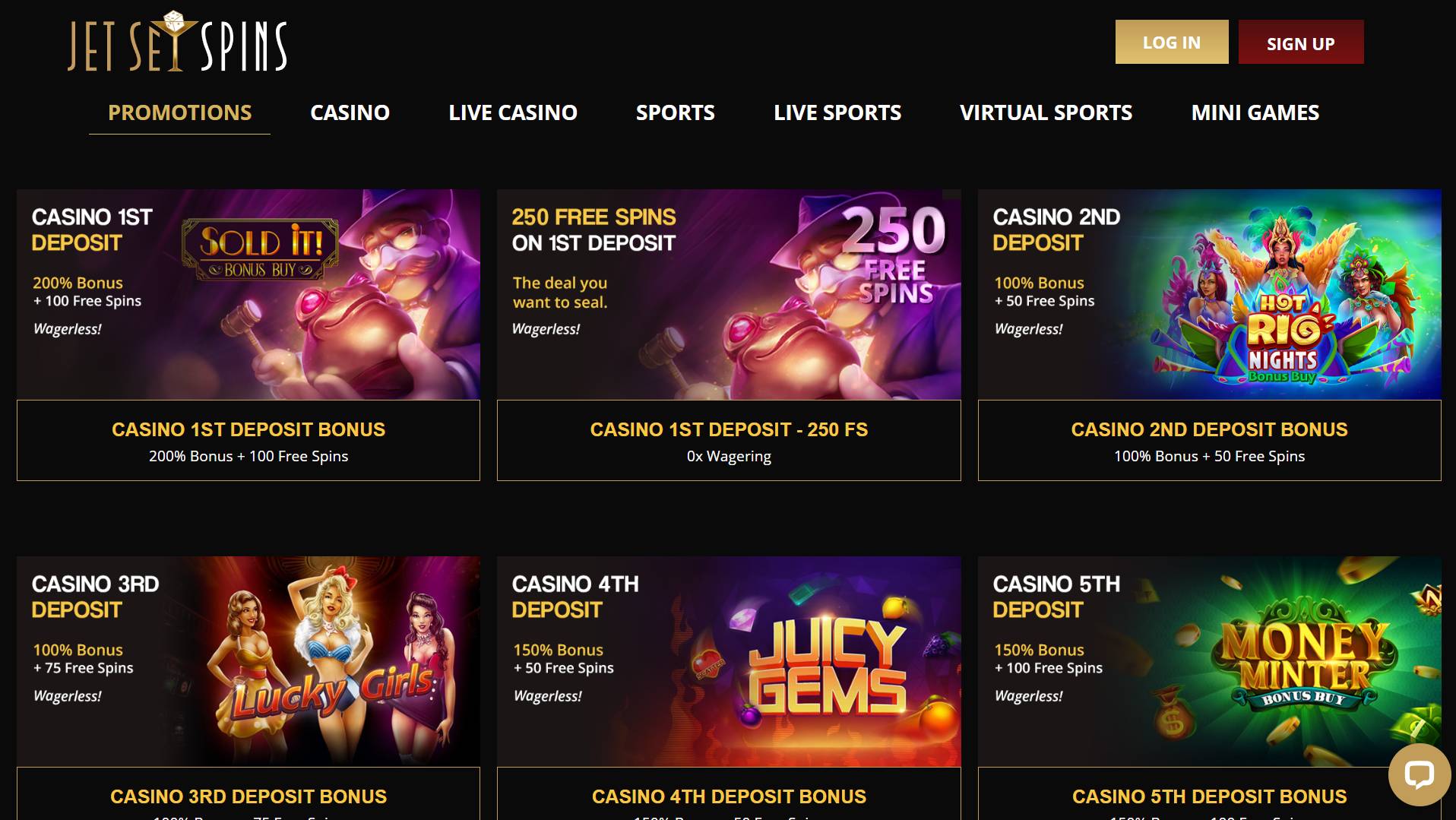 A heavy promotional layout defines JetSetSpins, where the welcome structure stretches across five deposits and heaps on both credit and spins. The first bonus offers 200% plus 100 FS, and an alternate first option gives 250 free spins with 0x wagering, which holds strong real value since spins convert directly to withdrawable funds. Follow-up deposits award 100%, 100%, 150% and another 150% alongside additional spins. Slot-focused users receive weekly 10% cashback capped at €10,000, while sports bettors enter with a 100% up to €1,000. A referral system adds €50 for each friend who joins and deposits.