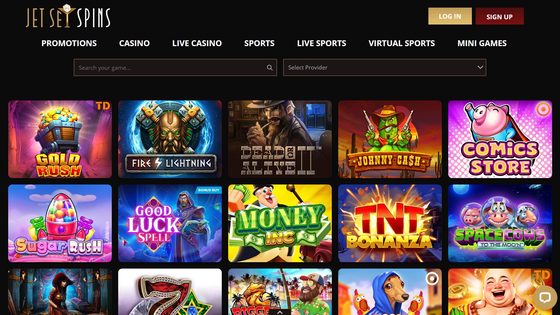 A slot-heavy layout makes JetSetSpins stand out more than its live suite. New releases, bonus buy slots, megaways variants and volatility ranges give room for different playstyles. The catalogue refreshes often, meaning seasonal picks rotate in and out.