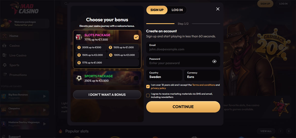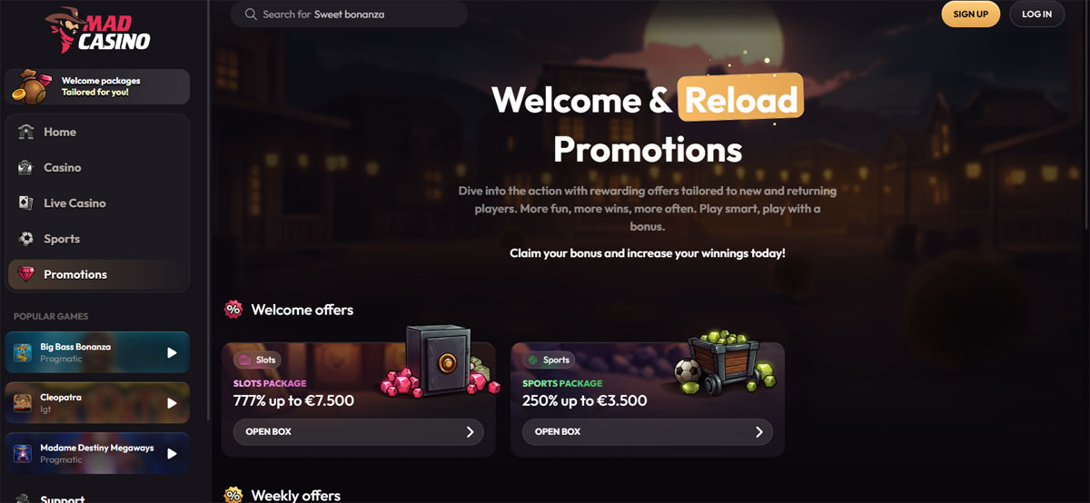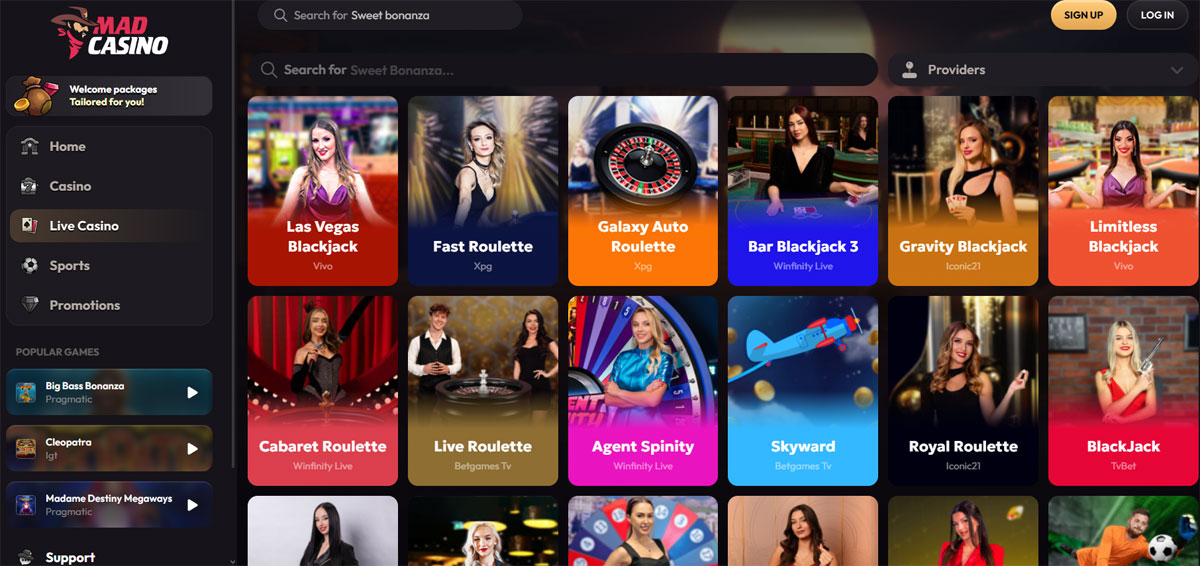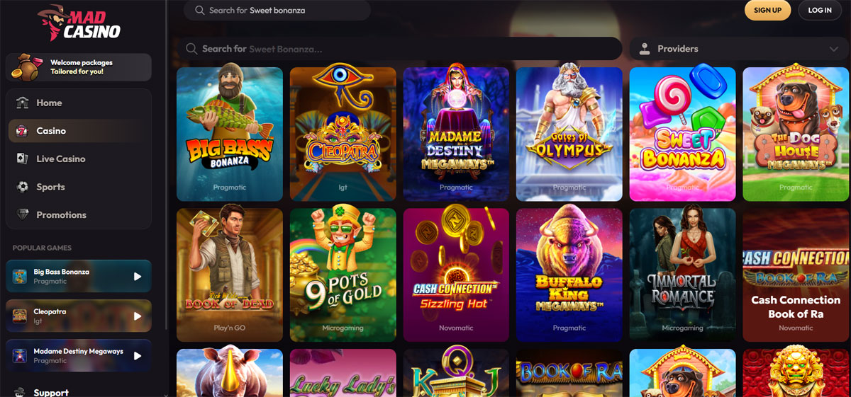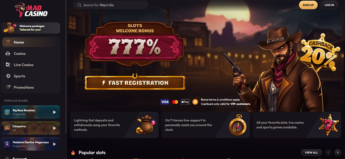 Mad Casino is an online gaming platform offering a broad mix of slots, table games, live dealer titles, and a sportsbook, giving players plenty of entertainment options in one place. The website features a modern, colorful design that is easy to navigate, and the registration process is straightforward. Payment flexibility is a highlight, with support for both traditional methods and popular cryptocurrencies. The platform also includes regular promotions and bonuses designed to engage returning players.