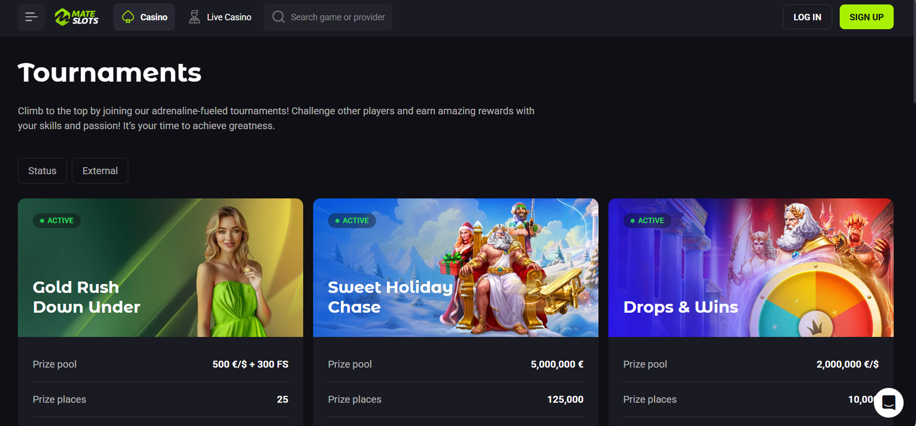 MateSlots Casino keeps players engaged with a variety of promotions and rewards. New members can kick things off with a generous welcome bonus that often includes a combination of deposit matches and free spins. Regular players can take advantage of weekly and seasonal bonuses, reload offers, and special event promotions designed to boost their bankroll. The casino also runs exciting tournaments where players can compete for cash prizes and leaderboard rewards. On top of this, the loyalty program allows players to earn points with every bet, which can later be redeemed for bonuses, free spins, or other exclusive perks.