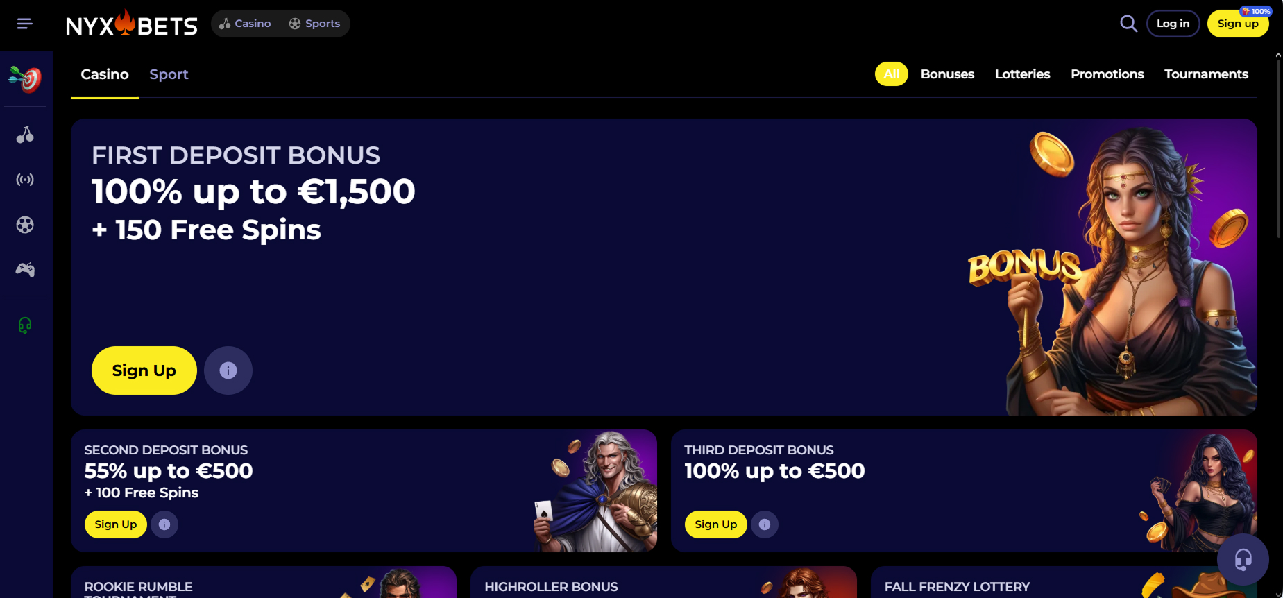 NyxBets Casino offers a generous welcome bonus spread over the first three deposits. The first deposit typically comes with a 100% match up to €150 plus 150 free spins, while the second deposit offers a 55% match up to €150 and 100 free spins. The third deposit usually includes a 100% match up to €150, bringing the total potential bonus to €450 along with 250 free spins. Wagering requirements generally apply, often around 35× the bonus amount, and players should check the current terms and conditions, as offer details can vary depending on region and promotion periods.