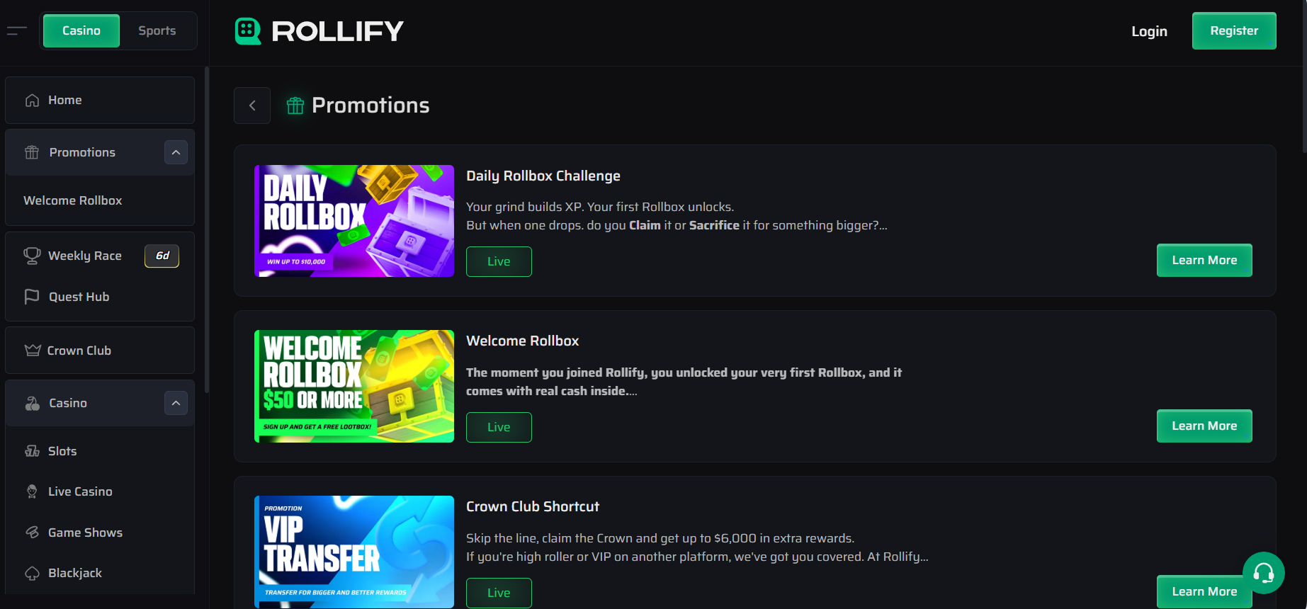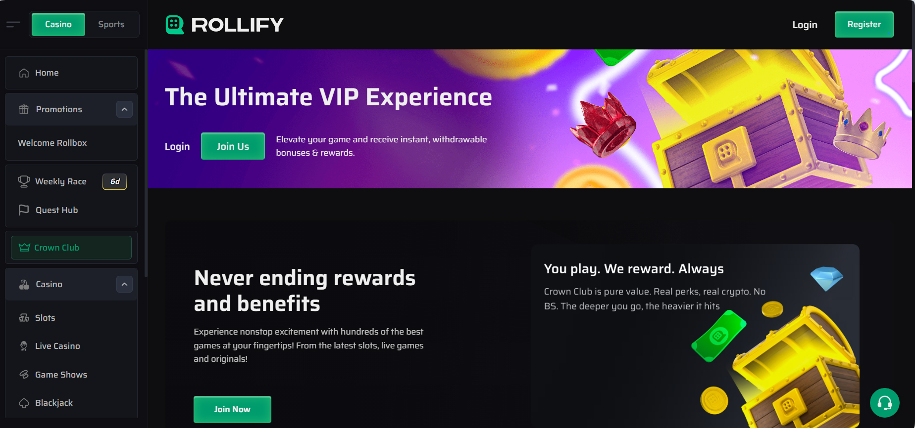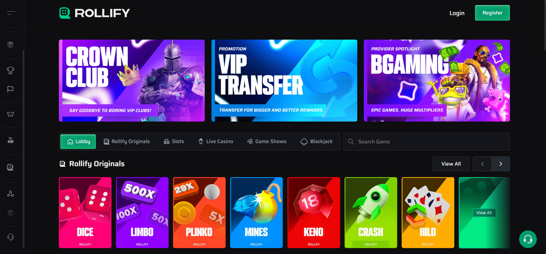 Rollify Casino is a streamlined, crypto‑centric platform that stands out for its large and varied game library, user‑friendly design, and fast transaction options. It’s licensed in Anjouan under Rollify Limitada, supporting a broad selection of games from over 30 providers, including big names like Pragmatic Play, Nolimit City, and Evolution Gaming. Their catalog reportedly includes more than 4,700 titles, with a particularly strong focus on slots, live tables, and provably fair in-house originals like Crash, Dice, and Limbo.