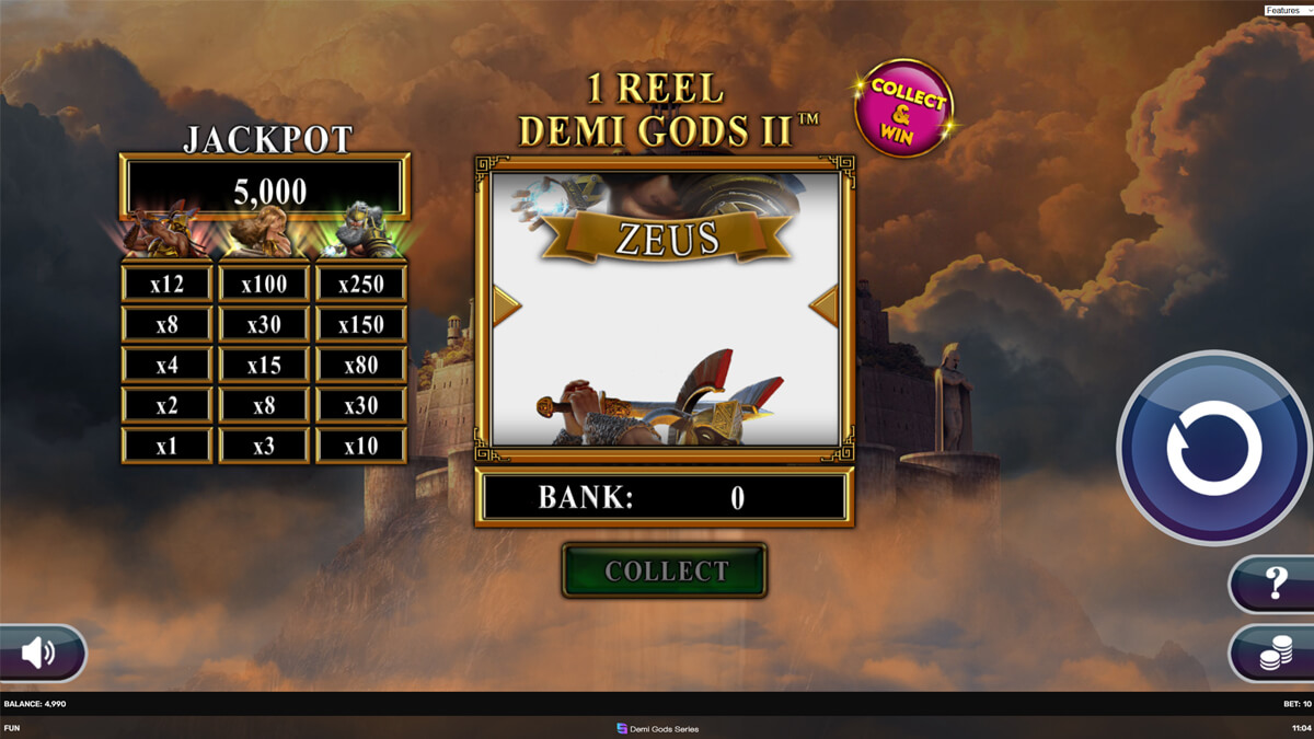 Visually, the game mirrors the clean aesthetic of early entries in the series, employing sky blue tones, metallic weapons, and divine motifs tied to Zeus. Symbols include mythological warriors, shields, swords, and energy icons used for collection mechanics. The gameplay style is fast, iterative, and designed for short cycle decision making. Wild symbols bridge gaps for line wins, while the Energy collection builds a temporary reservoir of accumulated returns that can be cashed out or risked for further growth.