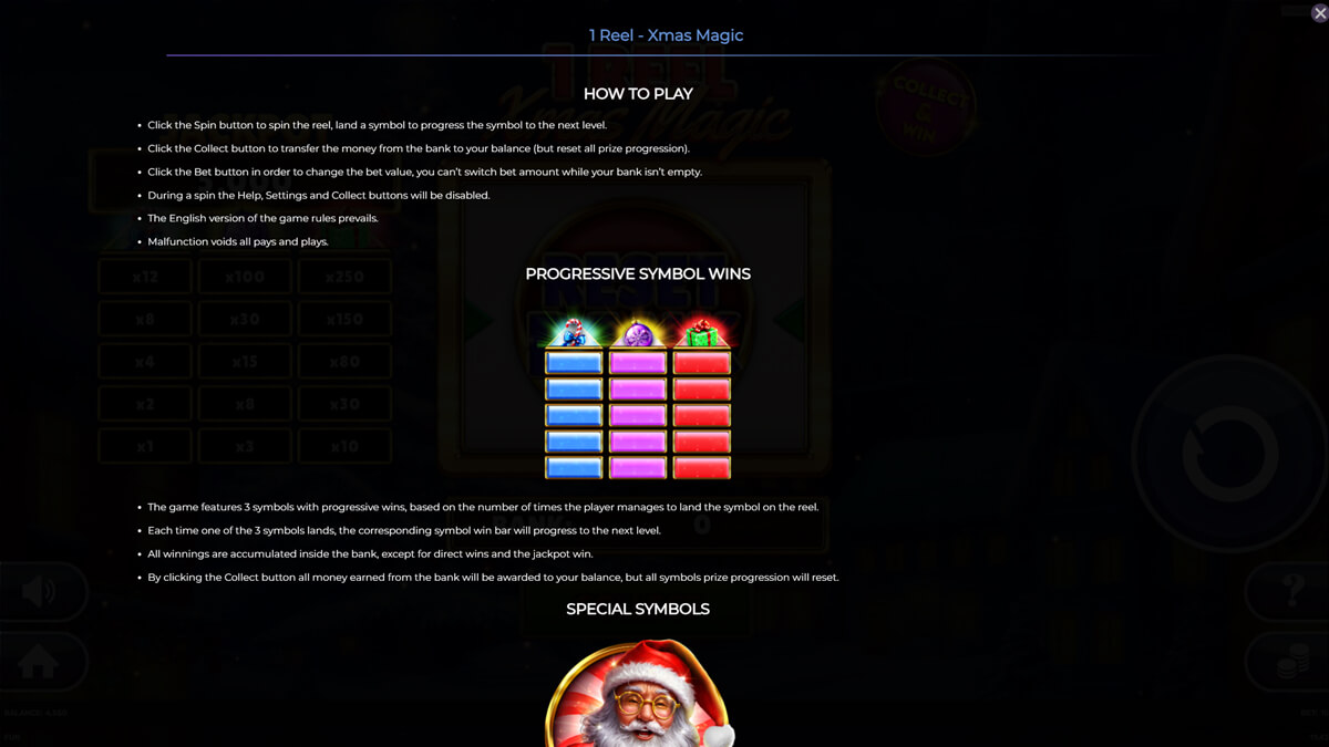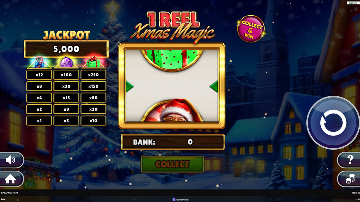 Visually the slot leans into a curated Christmas setting, using winter blues and midnight black backgrounds to contrast the warm lights of gifts, ornaments, and Santa themed iconography. The mechanics rely heavily on Collect and Growing Prize elements, forming a reward loop based on periodic harvesting of stored values. Wild symbols reinforce the cycle by slotting into missing spots and assisting with key prize alignment. The single reel formatting results in faster spin cycles and a compressed gameplay rhythm suited to short or analytical sessions.