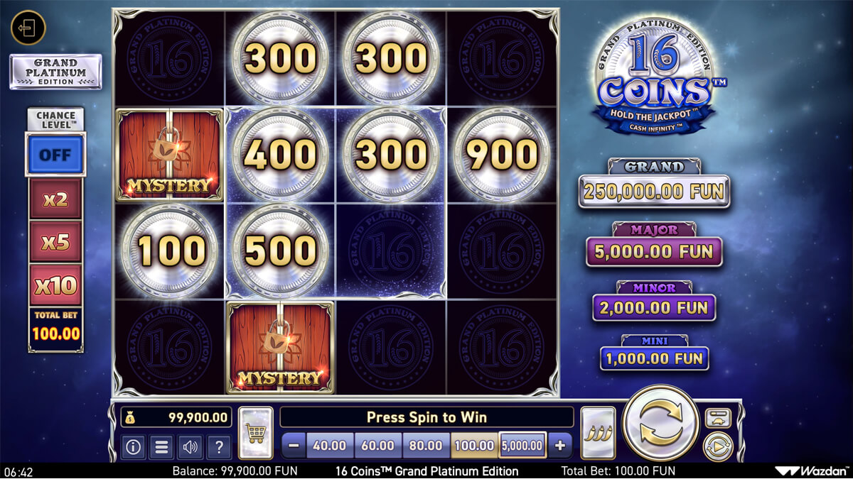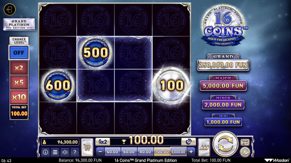 16 Coins Grand Platinum Edition operates on a 4×4 grid with no paylines and no traditional symbol wins. RTP is fixed at 96.16 percent, volatility is classified as high, and the maximum achievable win is capped at 2500x the stake. Bets range from 0.2 to 1000, with effective exposure increasing significantly when Chance Level modifiers are activated.