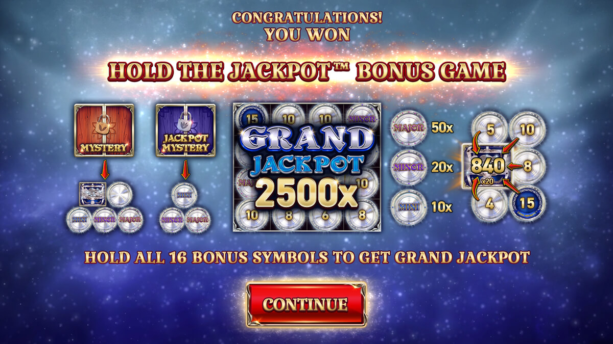 The theme follows Wazdan’s established Coins aesthetic, using platinum toned coins, deep blue cosmic backdrops, and restrained animations. Symbols are designed with functional clarity, prioritizing value readability over decorative complexity. Gameplay is entirely bonus centric, with all meaningful outcomes occurring inside the Hold the Jackpot feature rather than during regular spins.