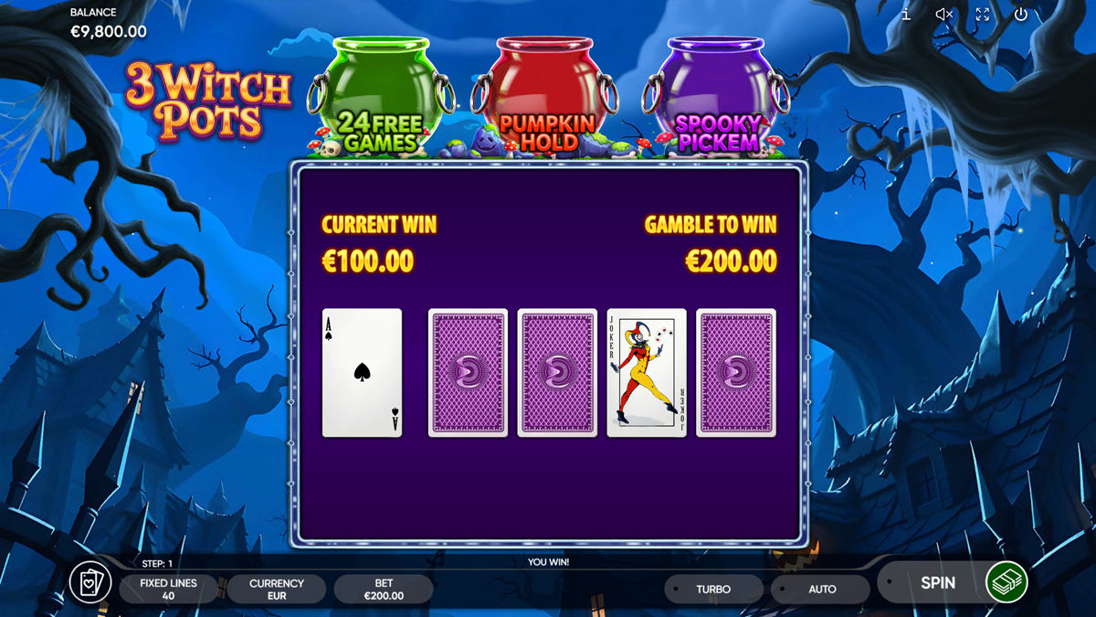 3 Witch Pots is built on a 5 reel, 4 row layout with 40 fixed betways, placing it firmly within the modern standard grid category. The RTP is listed at 96 percent, while volatility is not formally stated by the provider, though gameplay behavior indicates a medium to high variance profile. The maximum win is capped at 1,300x the total bet, and wagers range from 0.40 to 200 per spin, offering a broad exposure window.