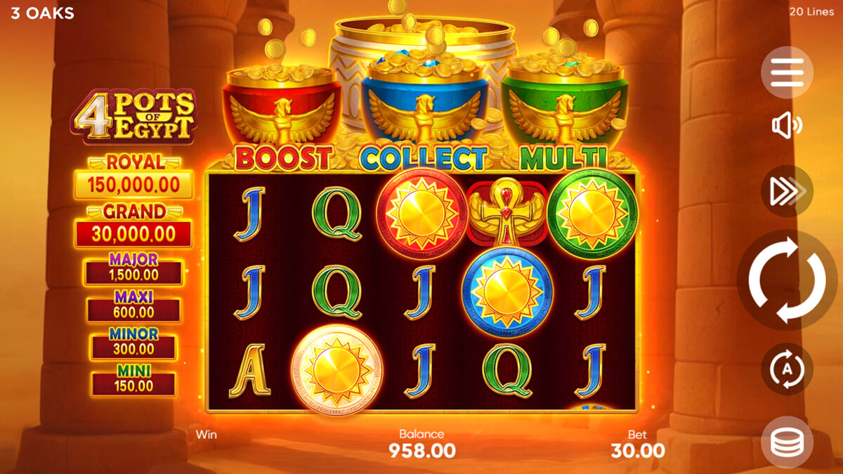4 Pots of Egypt includes a Hold and Win bonus round and does not offer free spins.