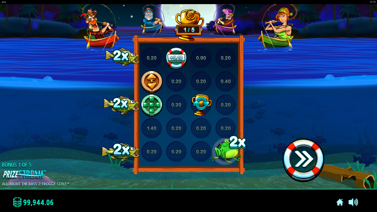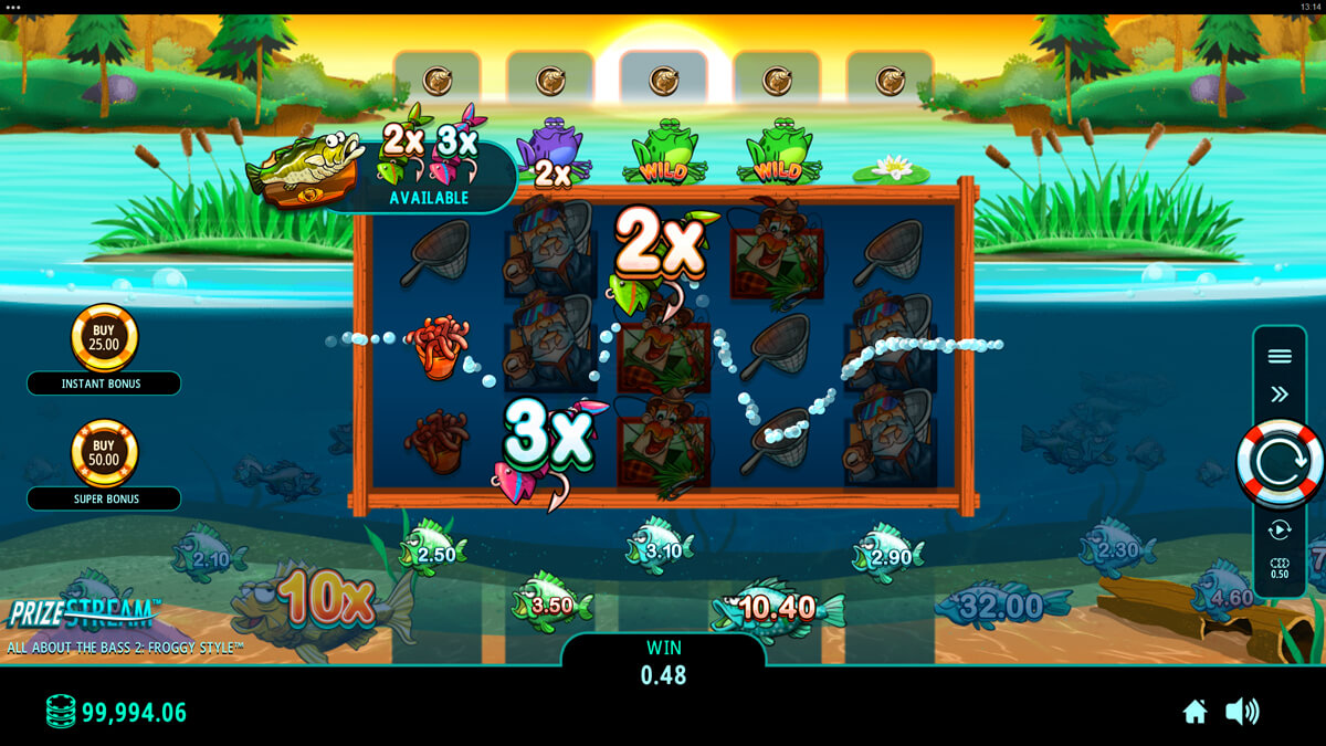 Visually, the slot adopts a cartoon styled nature theme featuring frogs, insects, fish, and a fisherman motif. Symbols are oversized and expressive, while animations emphasize Wild multiplier activation and collector events. Gameplay revolves around standard line wins supplemented by random rewards, Cash Collector mechanics, and Wilds carrying 2x and 3x multipliers that directly scale winning combinations.