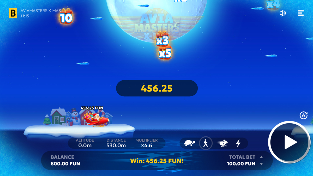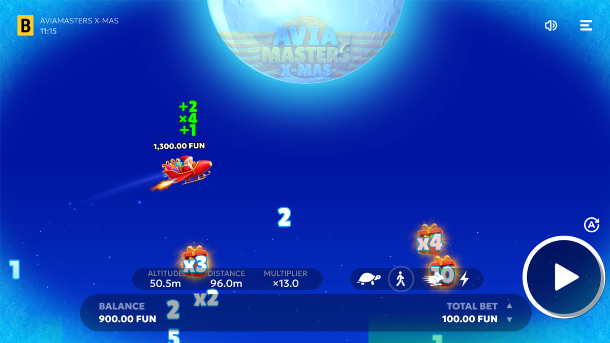 Aviamasters X-mas transforms BGaming’s aircraft crash system into a seasonal model with Santa’s sleigh replacing the core vehicle. The technical backbone remains anchored by a 97 percent RTP and a low volatility rating, with maximum exposure fixed at x250. The narrow risk distribution, combined with a min bet of 0.1 and max bet of 100, creates a mathematically conservative experience designed for extended sessions rather than spike hunting. There is no payline structure or grid, as outcomes rely entirely on the sleigh’s flight path and encountered modifiers.