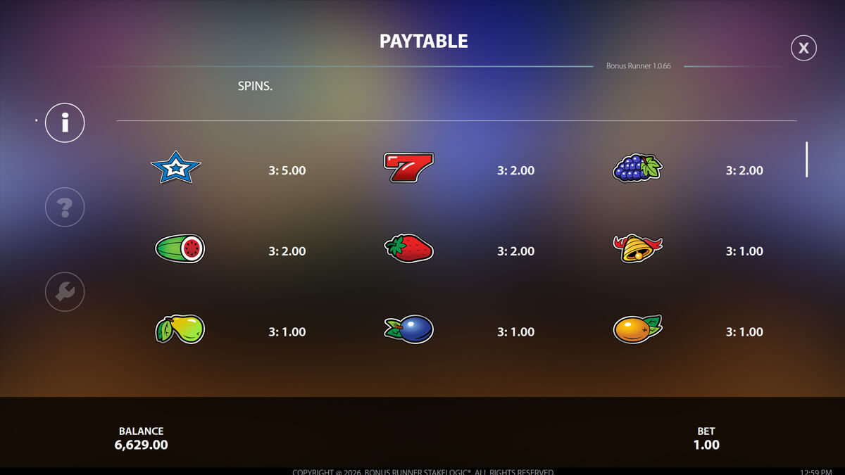 Bonus Runner is not part of a named series and does not function as a sequel. While it shares visual DNA with other StakeLogic fruit slots, its payout logic and irregular ways structure distinguish it mechanically. The game should be viewed as an experimental branch within StakeLogic’s classic catalog rather than a clone or reskin.