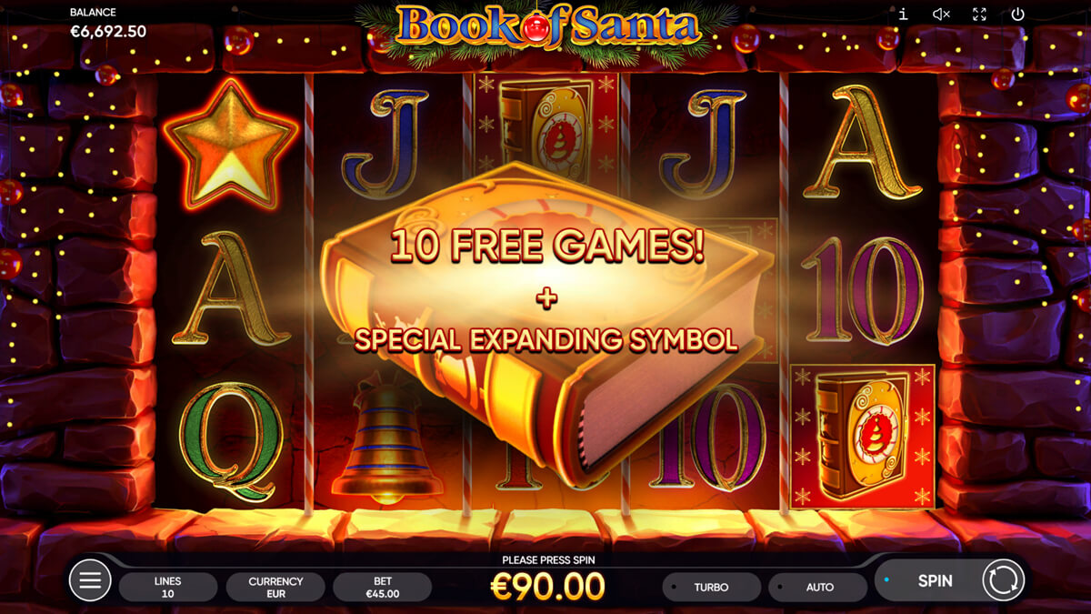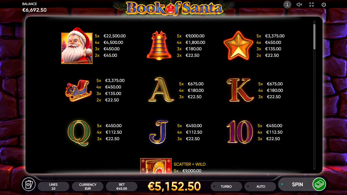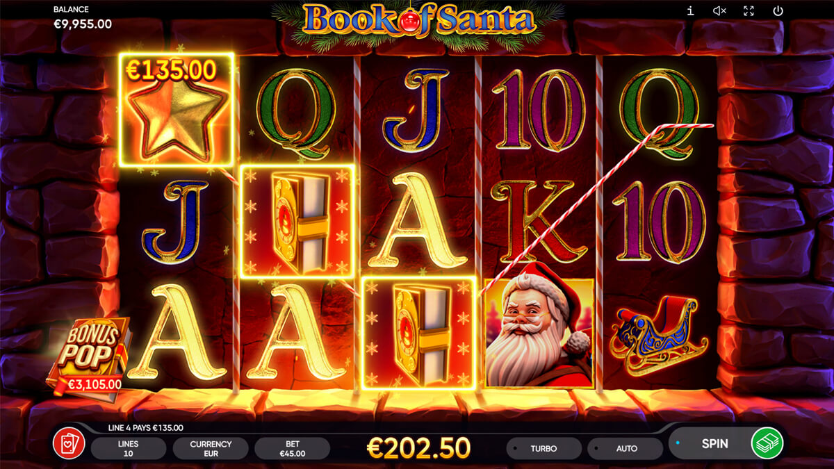 Book of Santa uses a traditional 5 reel, 3 row layout with 10 fixed paylines. The RTP is set at 96 percent, while the volatility is not officially stated by the provider but aligns with medium to high expectations due to the expanding symbol mechanic. There is no confirmed maximum win figure published by Endorphina, positioning the slot away from extreme payout marketing and toward steady, repeatable play. Bets range from 0.01 to 50 per spin.