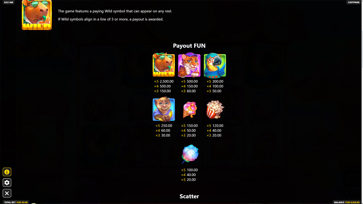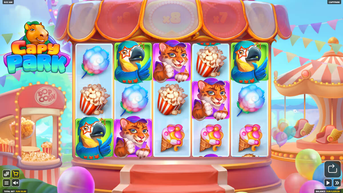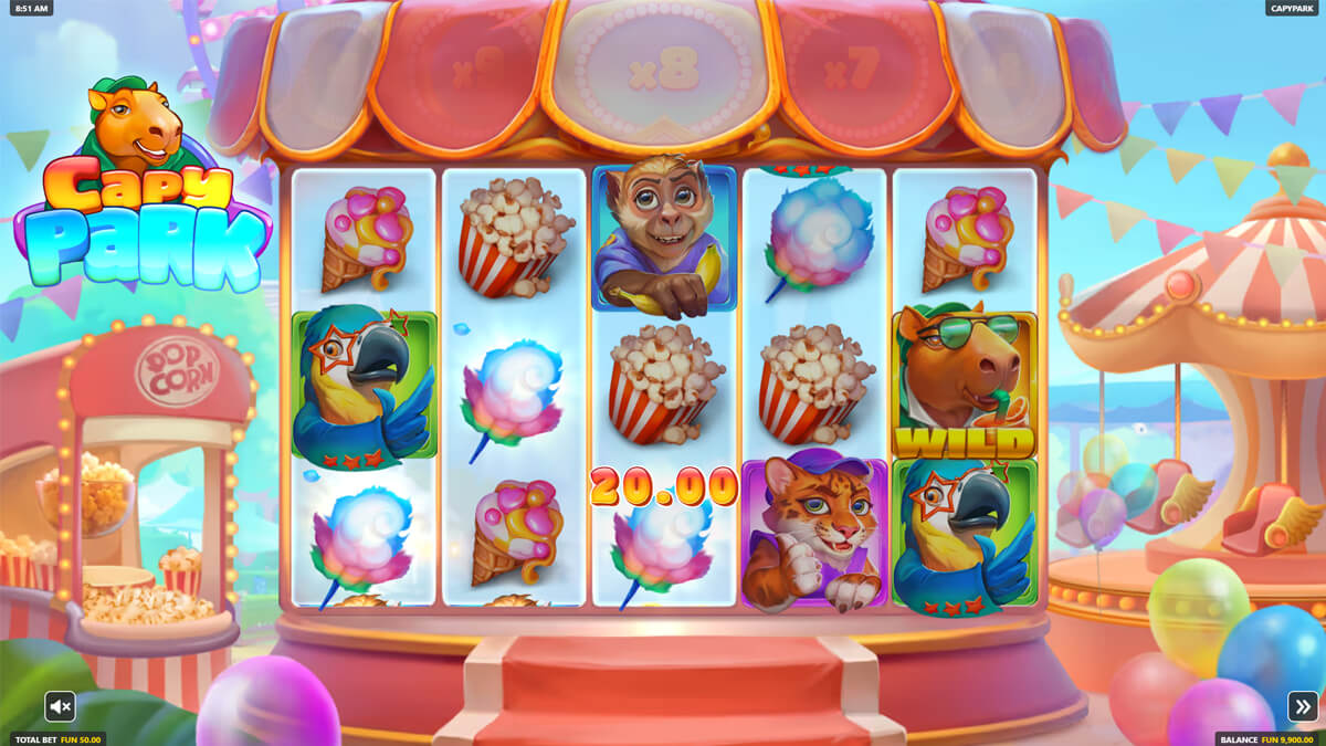 Capypark UP-X is a standalone release and not part of an established series. While it borrows common industry mechanics such as random multipliers and bonus wheels, its thematic execution and specific combination of features do not mirror a single existing title. The amusement park framing and animal cast differentiate it from generic carnival slots, positioning it as an original composition rather than a reskin.