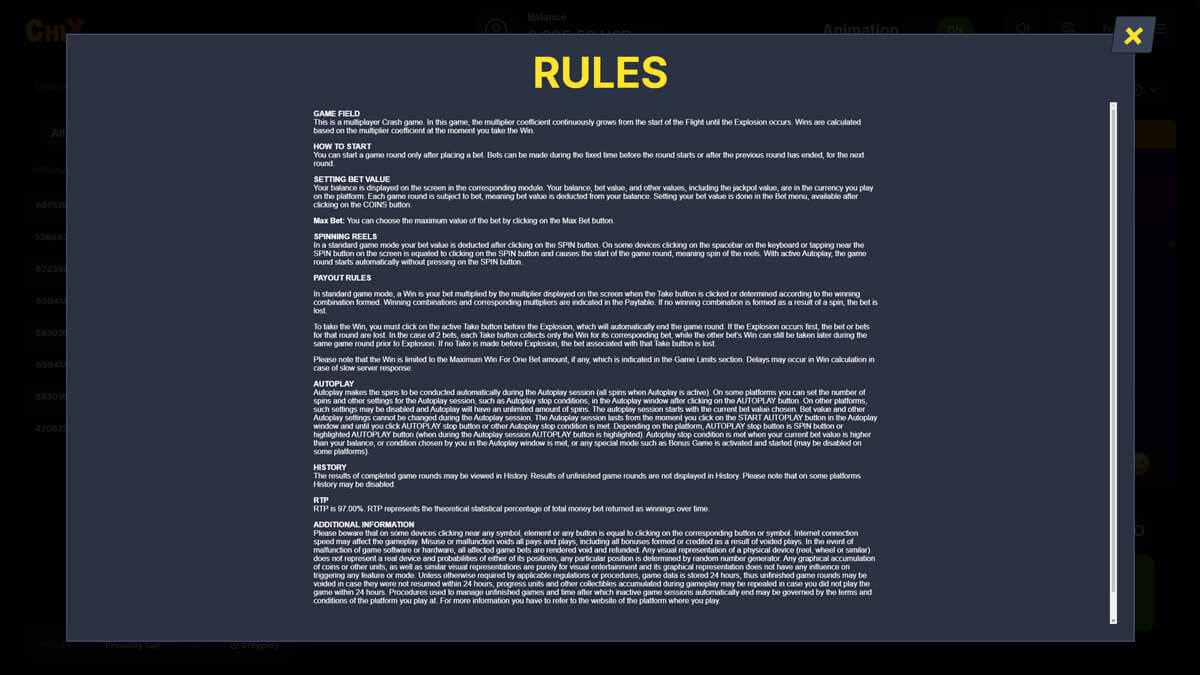 ChiX was released by Onlyplay in December 2025 as a continuation of its X series crash titles. The game replaces rockets and balls from earlier entries with a flying chicken ascending through space while the multiplier increases until a random burst event ends the round. RTP is fixed at 97 percent, volatility is inherently high, and the maximum achievable win is x10000 of the stake. Bets range from 0.1 to 50 depending on operator limits.