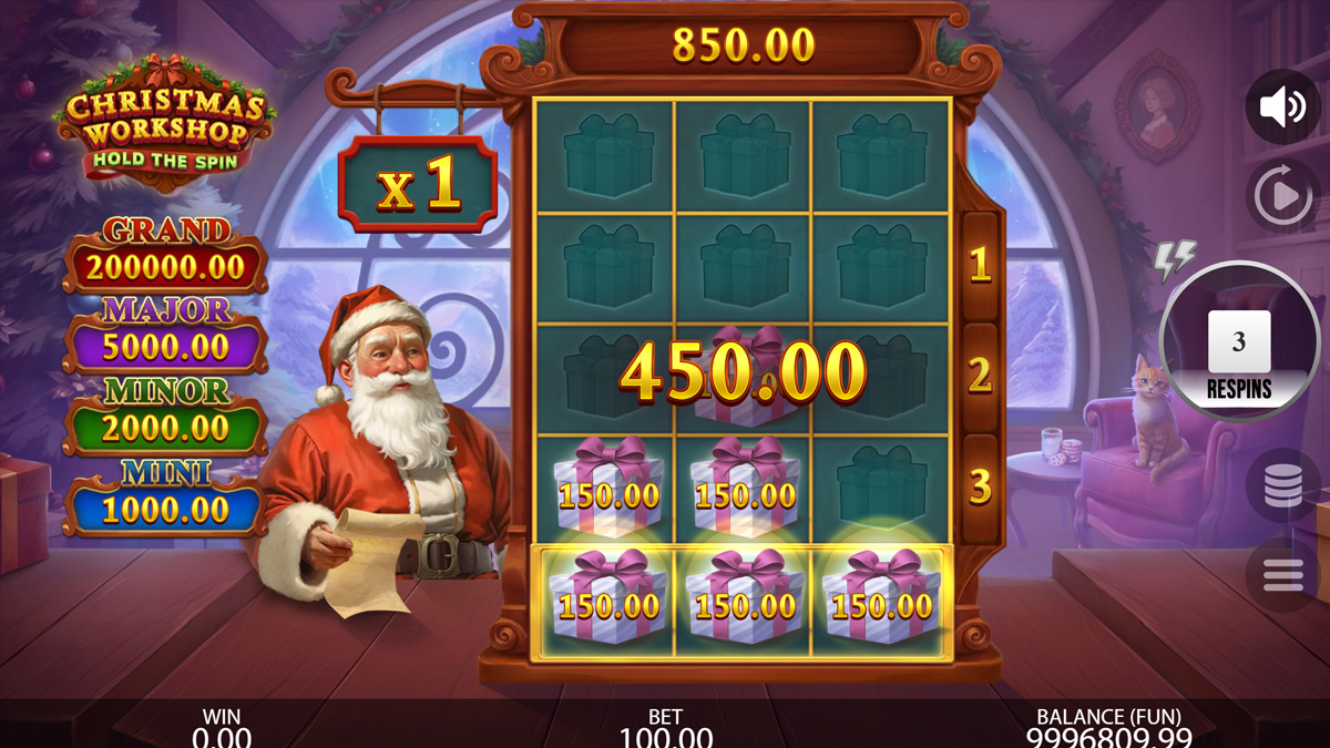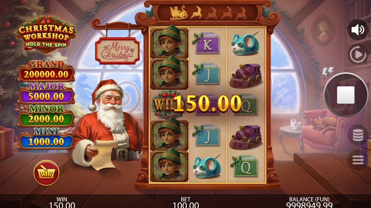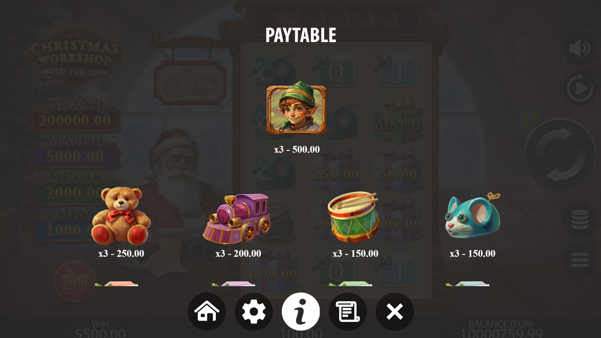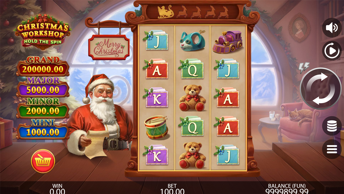 Christmas Workshop Hold the Spin is constructed around a 3 reel by 5 row framework supported by 125 pay ways, giving it a compact but dense configuration that allows frequent symbol contacts across the grid. The default RTP of 96.02 percent sits within an industry standard zone, while the alternative RTP versions of 92.02 percent, 94.01 percent, and 95.00 percent allow flexible deployment depending on jurisdiction. The volatility is explicitly high, and the mathematical structure supports the announced 10000x maximum exposure. These parameters align well with a prize tier system consisting of non progressive jackpots ranging from Mini to Grand.