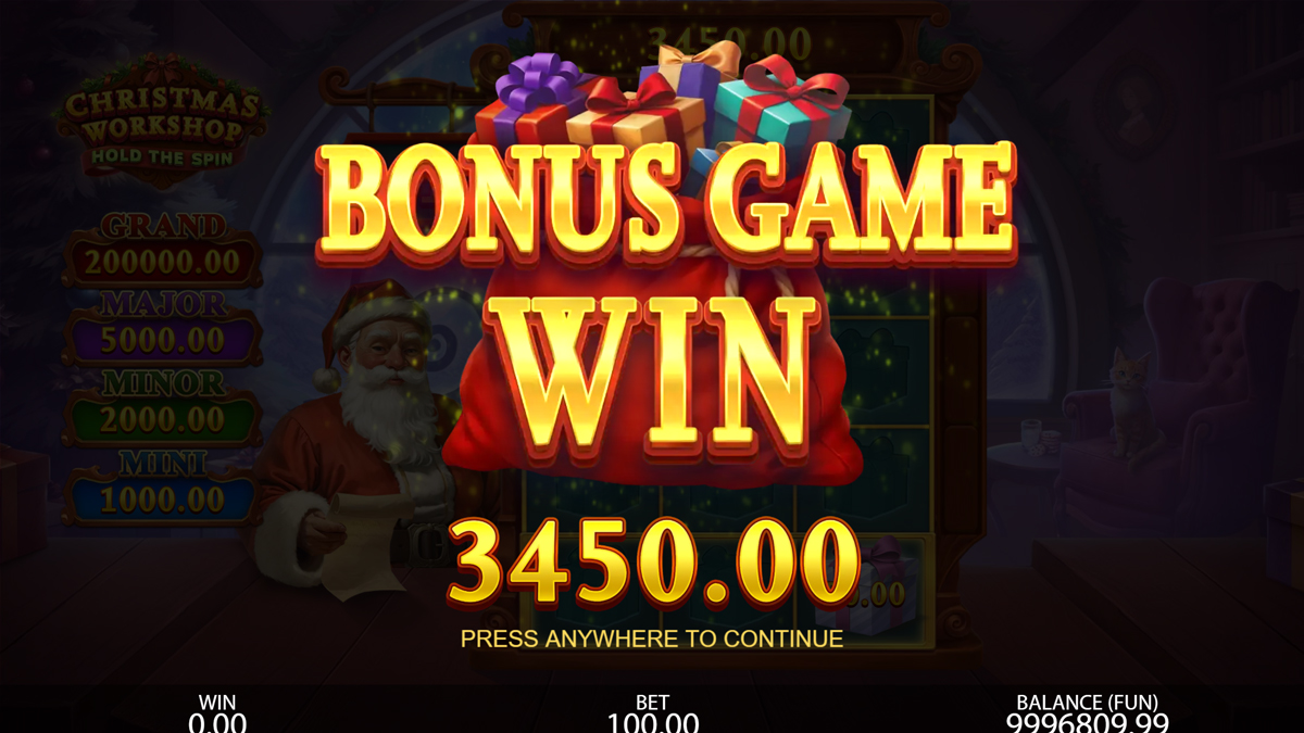 Christmas Workshop Hold the Spin applies a high volatility mathematical model to a compact 3×5 grid, yielding a system where symbol density, frequent prize cycling in the bottom row, and multiplier escalation interact to create steep variance profiles and episodic reward clustering. The engine relies on a deterministic downward symbol settling mechanism, producing controlled positional behavior during the Bonus Game while maintaining fully stochastic symbol generation. Its 10000x ceiling is statistically consistent with the high risk structure, especially given the persistence of the multiplier mechanic and the presence of fixed jackpot tiers embedded within Present symbols. The game operates on 125 pay ways, enabling dense hit sequences despite the high volatility setting, which creates a hybrid pattern that sits between classic hold mechanics and cascading reward cycles.