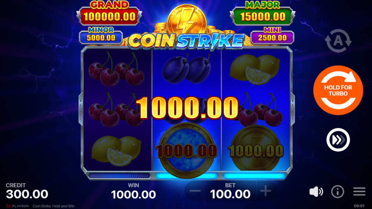 Visually, the slot remains loyal to Playson's fruit driven aesthetic, but the coin and lightning elements give it a more modern identity. Symbols include the classic cherries, lemons, oranges, plums, grapes, melons, BARs, and bells, with the Seven acting as the wild. Feature symbols such as Coins, Strike Bonus icons, and various jackpot coins add mechanical depth. The main gameplay loop emphasizes frequent transitions into collection or respin modes, maintaining momentum even though the base game itself remains straightforward.