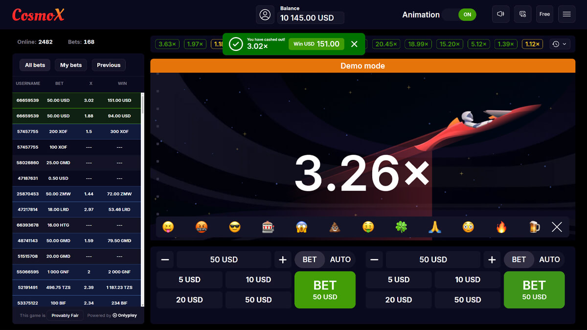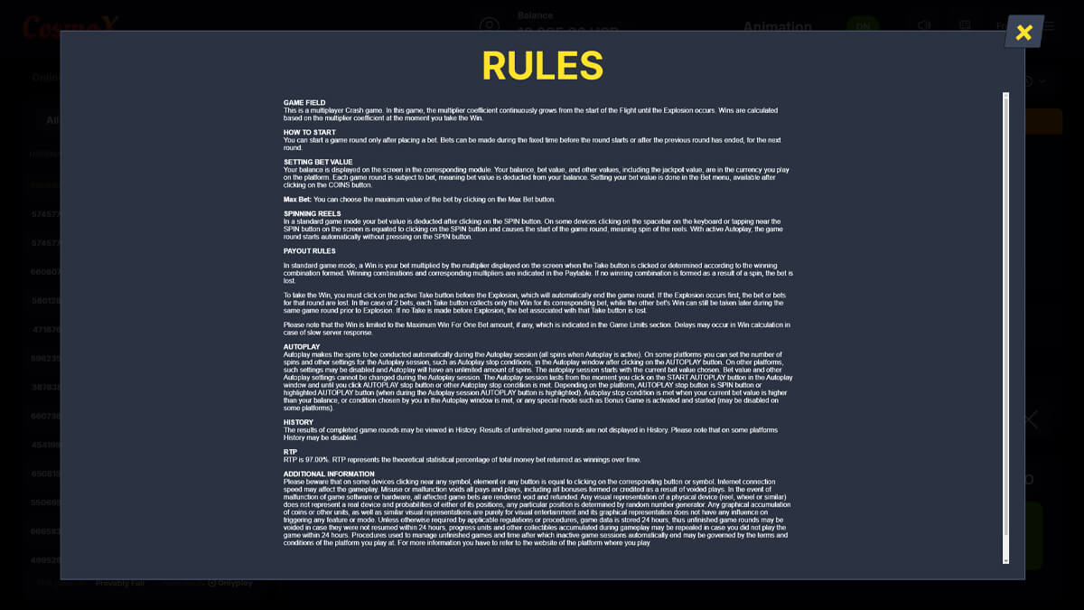 CosmoX is a lightweight crash game released by Onlyplay in November 2024 and positioned as the first entry in its X series. The game operates on a rising multiplier that increases until a random burst point terminates the round. RTP is fixed at 97 percent, volatility is adjustable based on cashout strategy, and the maximum exposure reaches x10000. Bets range from 1 to 50, with up to two bets allowed per round.