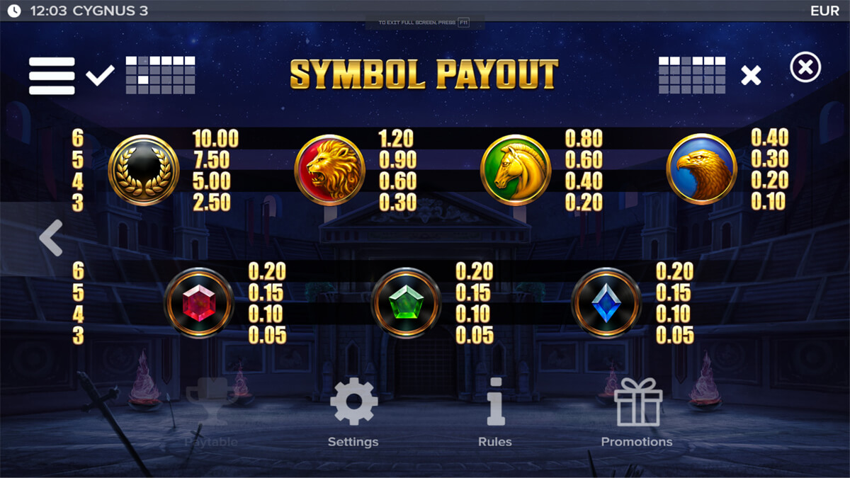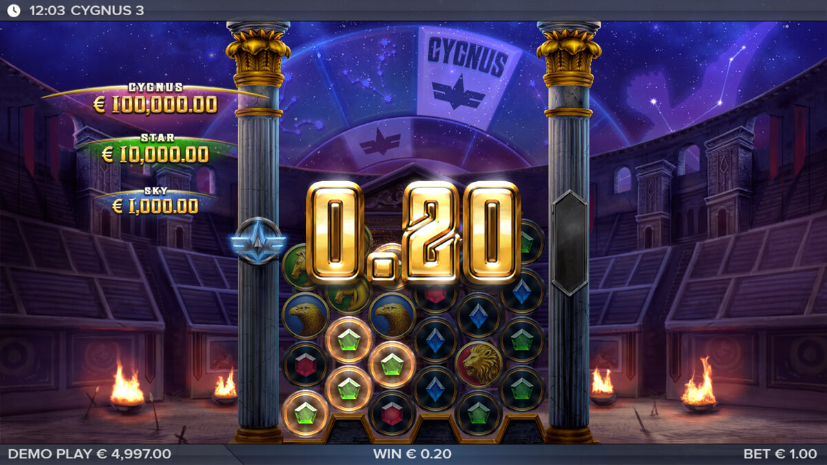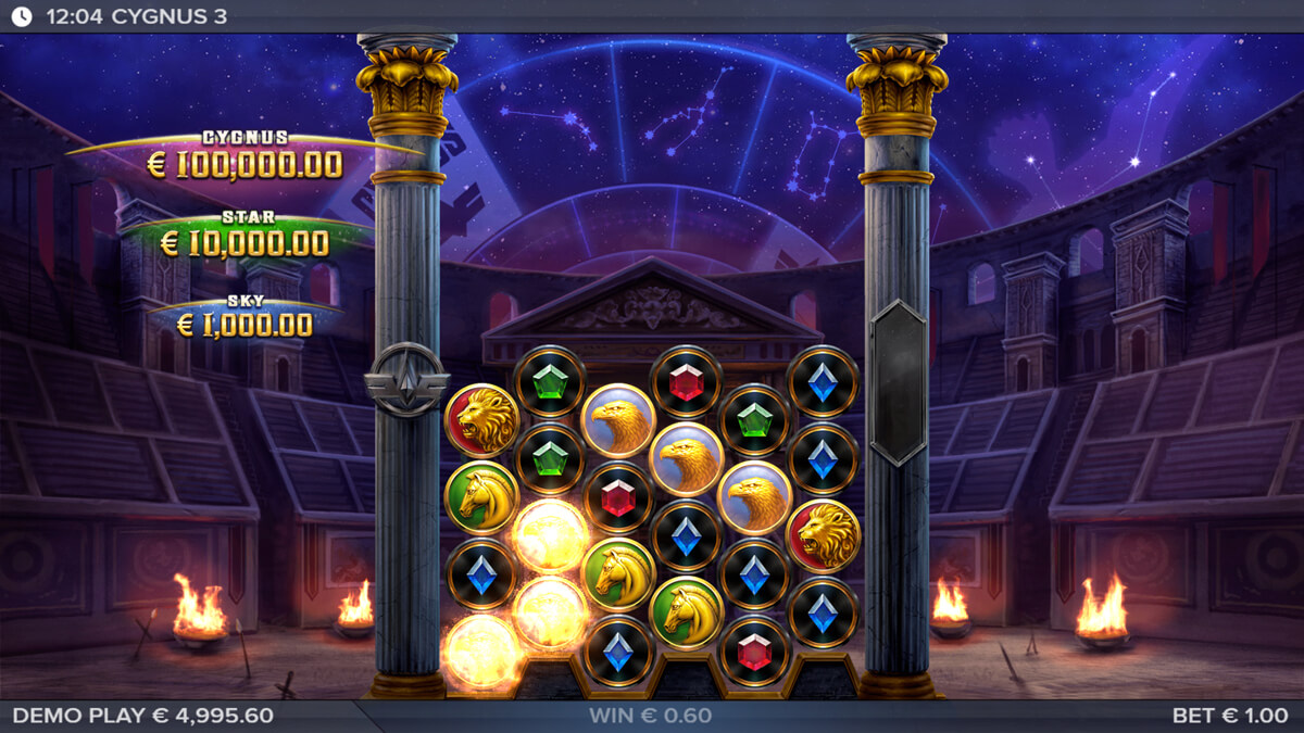 The theme merges ancient civilization motifs with cosmic imagery, placing the grid within a colosseum under a rotating star filled sky. Symbol design leans heavily on metallic coins and celestial emblems. Gameplay pacing alternates between steady gravity driven accumulation and abrupt variance spikes introduced by the Cygnus Wheel, creating a hybrid rhythm that differs from later multiplier focused sequels.