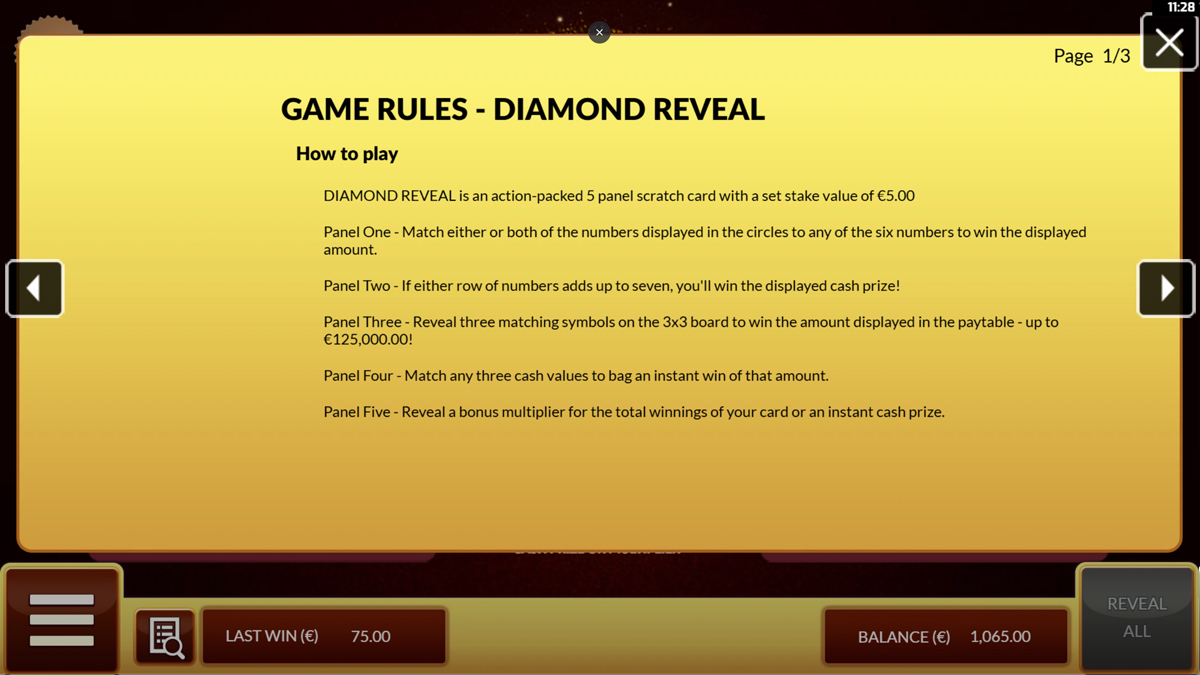 Diamond Reveal is structured as a five panel scratchcard using slot terminology for paylines but without spinning reels. The RTP is fixed at 93 percent with a low volatility classification. The maximum win reaches 125000 times the 5 unit stake, creating a theoretical maximum payout of 625000 currency units from a single card. The betting range is fixed at exactly 5 units, removing any variation in stake size.