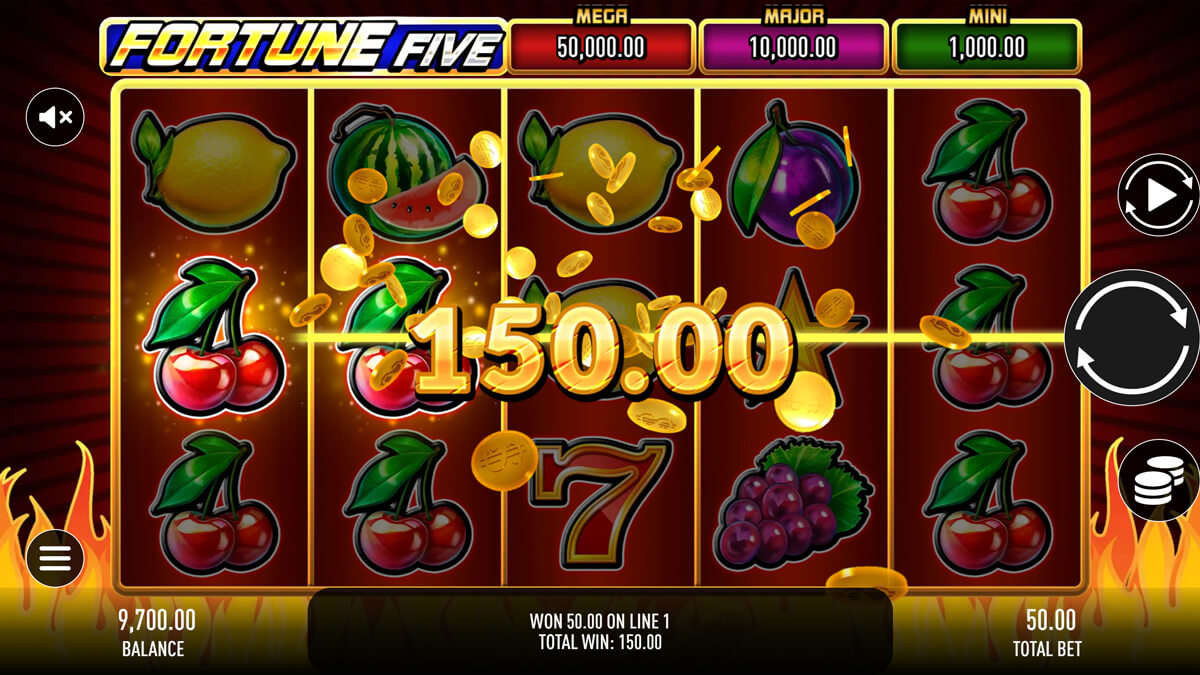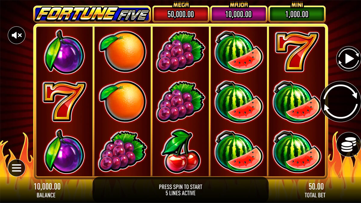 Fortune Five operates on a 5×3 reel layout with five fixed paylines and an RTP of 96.27 percent. The declared high volatility places the game firmly in the risk heavy category, where payouts are concentrated into less frequent but more meaningful events. While the maximum win is not formally disclosed, the presence of multiple jackpot tiers defines the upper reward boundary.