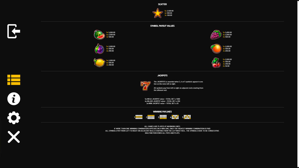The base game uses a traditional five reel, three row grid with five paylines, producing a narrow but focused combinational matrix. Symbol weighting favors low value fruits, ensuring frequent non winning spins that sustain volatility while preserving the potential for sudden high value alignments.