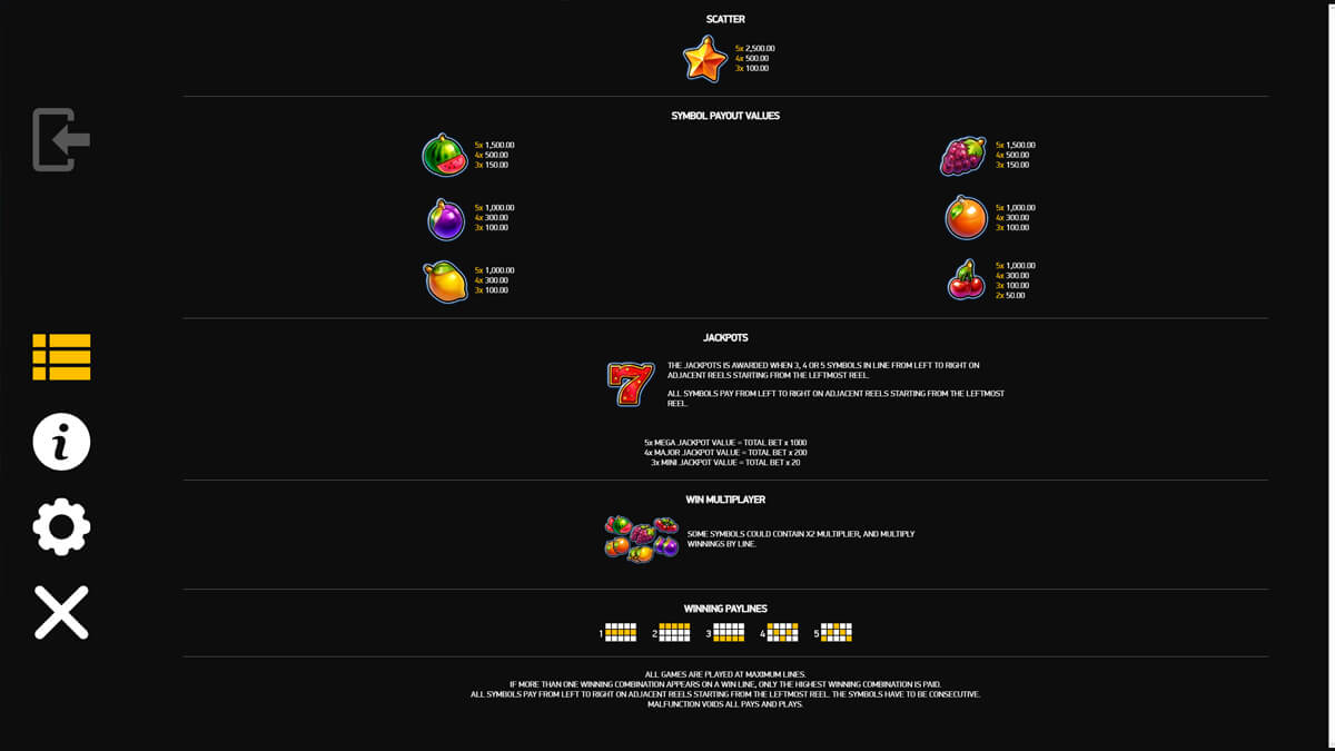 The base game follows a standard left to right payline evaluation across five fixed lines. Symbols consist of traditional fruit icons and classic slot emblems, each contributing to straightforward payout calculations. Scatter symbols pay anywhere on the grid, independent of paylines, adding secondary reward potential.