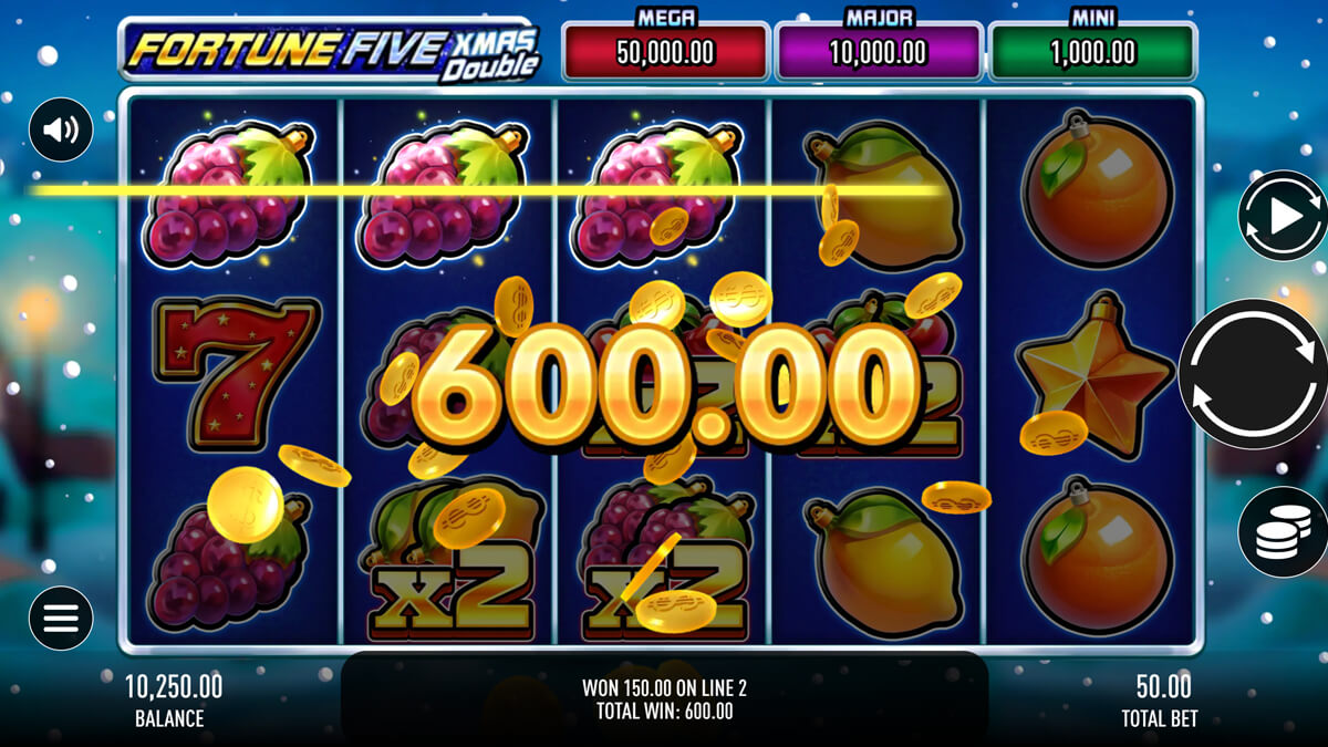 Fortune Five Xmas Double functions as a seasonal variant rather than a mechanical evolution. Its structure mirrors traditional five line fruit slots, with Christmas visuals layered on top without altering underlying math or mechanics. While not a clone of a specific prior title, it clearly draws from a long established design template rather than introducing new gameplay concepts.