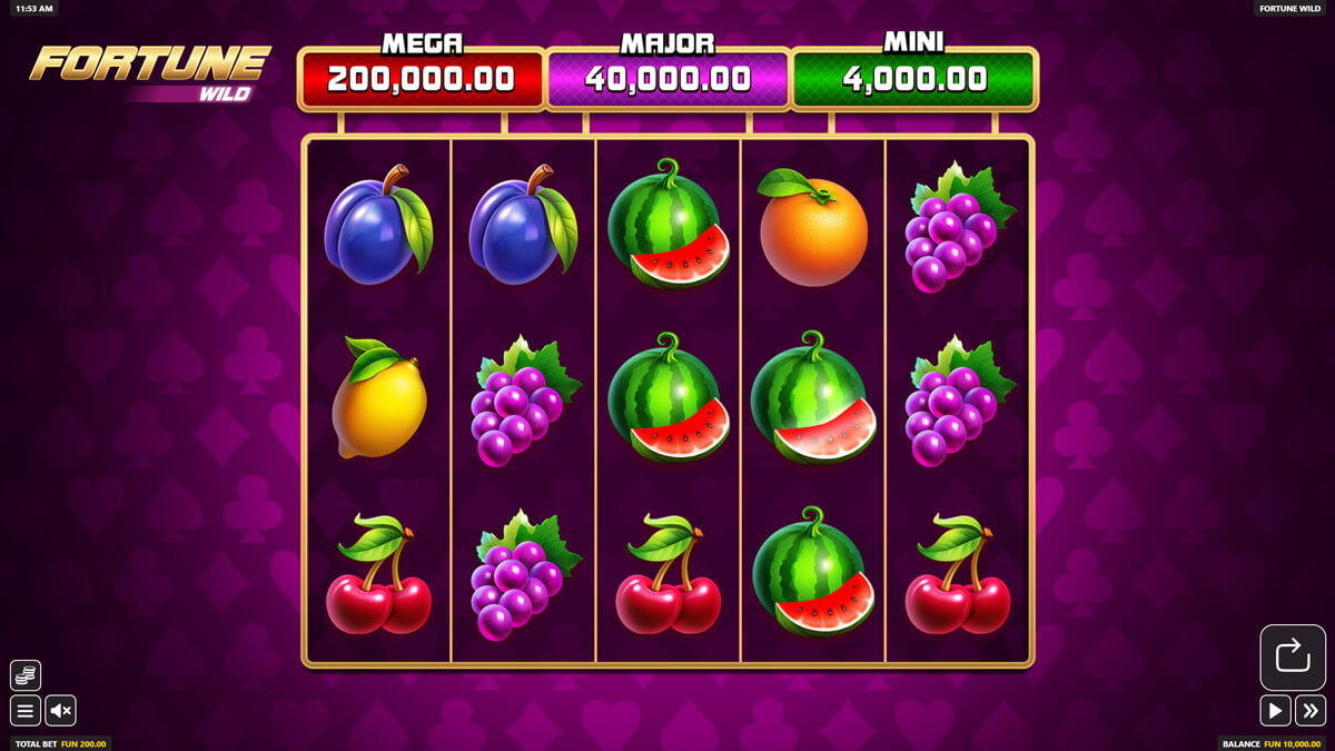 Fortune Wild is a classic style fruit slot built on a 5×3 reel grid with 5 fixed paylines. The game operates with an RTP of 96.02 percent and a capped maximum win of 1000x. Volatility is not formally stated, but outcome distribution suggests a low to medium risk curve driven almost entirely by expanding wild interactions and jackpot symbol clustering.