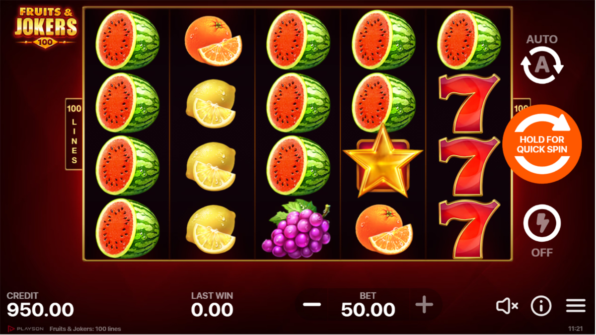 Fruits Jokers: 100 Lines uses mechanical clarity and predictable symbol distribution to create a familiar pattern recognition environment. Players interpret stacked formations, anticipate line intersections, and respond to visually dense reel states that often signal above average outcomes. The simplicity of interaction reduces cognitive load, allowing focus on pattern emergence and rhythm tracking.