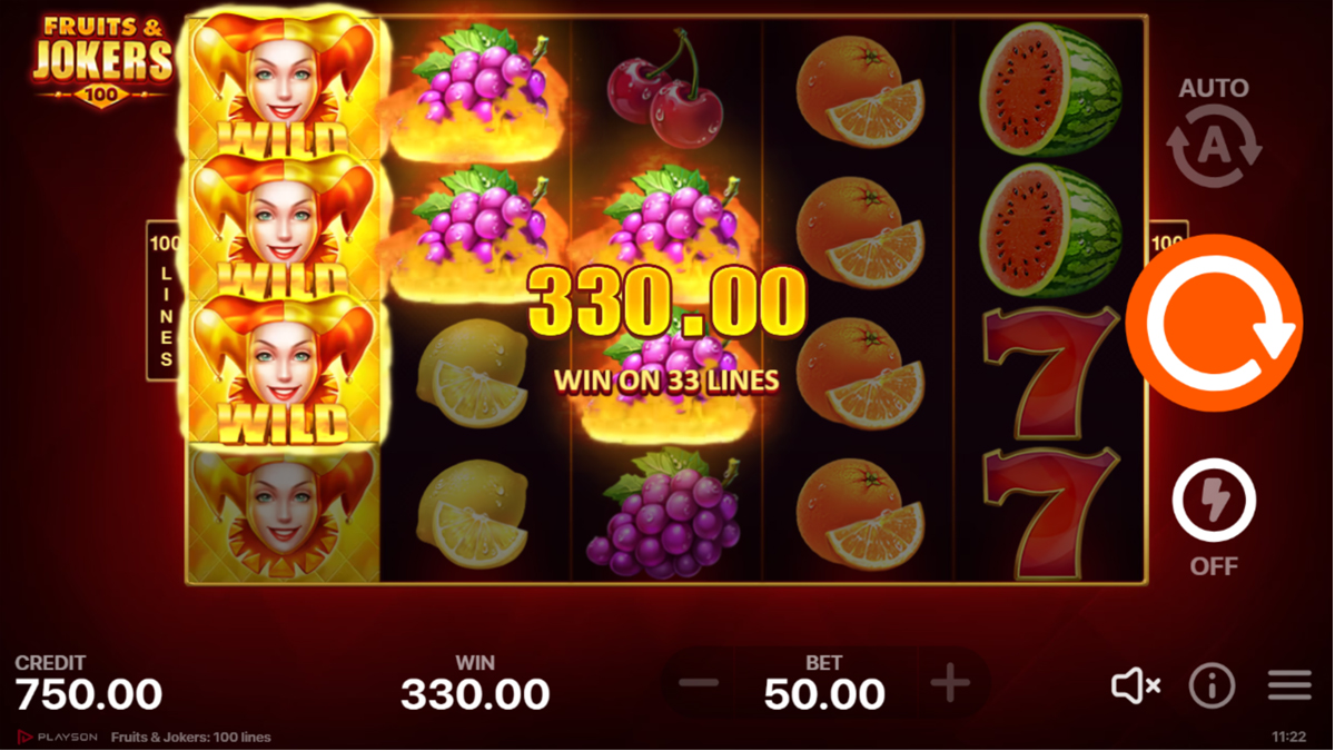 Playson typically engineers medium volatility fruit slots with controlled payout behavior, focusing on line driven outcomes rather than heavy feature reliance. Their mathematical frameworks usually emphasize RTP stability, consistent symbol distribution, and stacked mechanics to build occasional higher magnitude results. Fruits Jokers: 100 Lines fits this style, strengthening its identity with expanded paylines that reflect Playson's focus on scalable classic slot design.