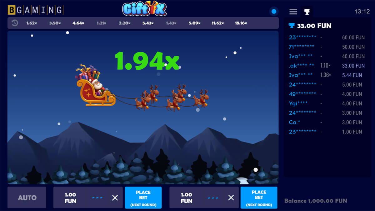 Visually, Gift X gravitates toward bright festive animation and animated gift-box presentation rather than traditional slot symbol sets. There is no reel or payline grid; instead, gameplay is driven by the act of selecting or “grabbing” a gift before Santa flies away, introducing a psychological tension not often present in classic slots. Features are minimal but functional: players may place one or two bets per round or enable autoplay with preset parameters. The game’s style lies in rapid resolution, risk-reward clarity and a holiday-themed casual game aesthetic rather than layered slot mechanisms or complex bonus rounds.