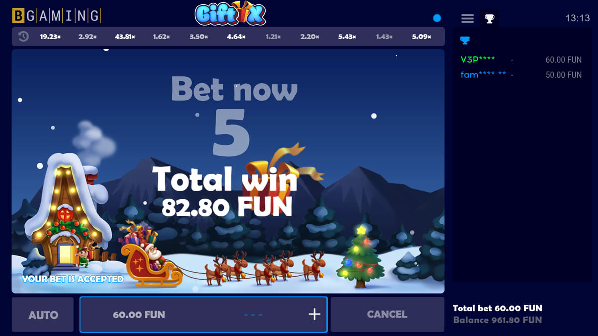 Gift X is structured to generate high anticipation and emotional engagement through timed decision pressure and the possibility of a large payoff. The countdown before selection, the act of grabbing gifts, and the unpredictability of multipliers all contribute to a heightened sense of tension and reward potential. Visual and thematic holiday cues enhance immersion and may encourage longer play sessions or repeated attempts under the guise of festive fun. The simplicity of the interface and the immediacy of outcome delivery reduce cognitive load and promote repeated engagement without requiring complex decision making.