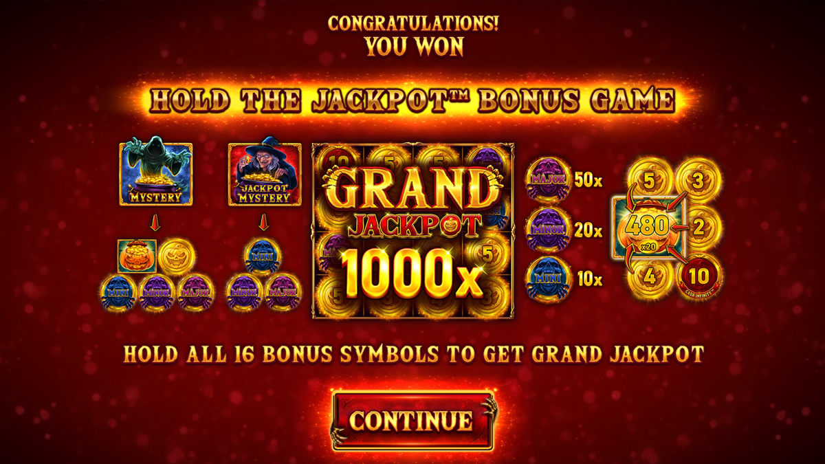 Haunted Coins X1000 uses a 4×4 grid with no paylines and no standard symbol wins. RTP is set at 96.18 percent, volatility is classified as high, and the maximum achievable win is capped at 1000x the stake through the Hold the Jackpot feature. Bets range from 0.25 up to 500, with effective exposure increased further when Chance Level modifiers are activated.