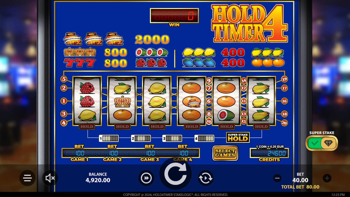 StakeLogic’s classic portfolio is characterized by restrained volatility, mechanical clarity, and feature sets rooted in land based fruit machine traditions. Hold4Timer reflects this approach through conservative payout limits, optional stake modifiers, and mechanical repetition. The developer consistently favors system driven engagement over cinematic variance, targeting players who value predictability and frequent interaction.