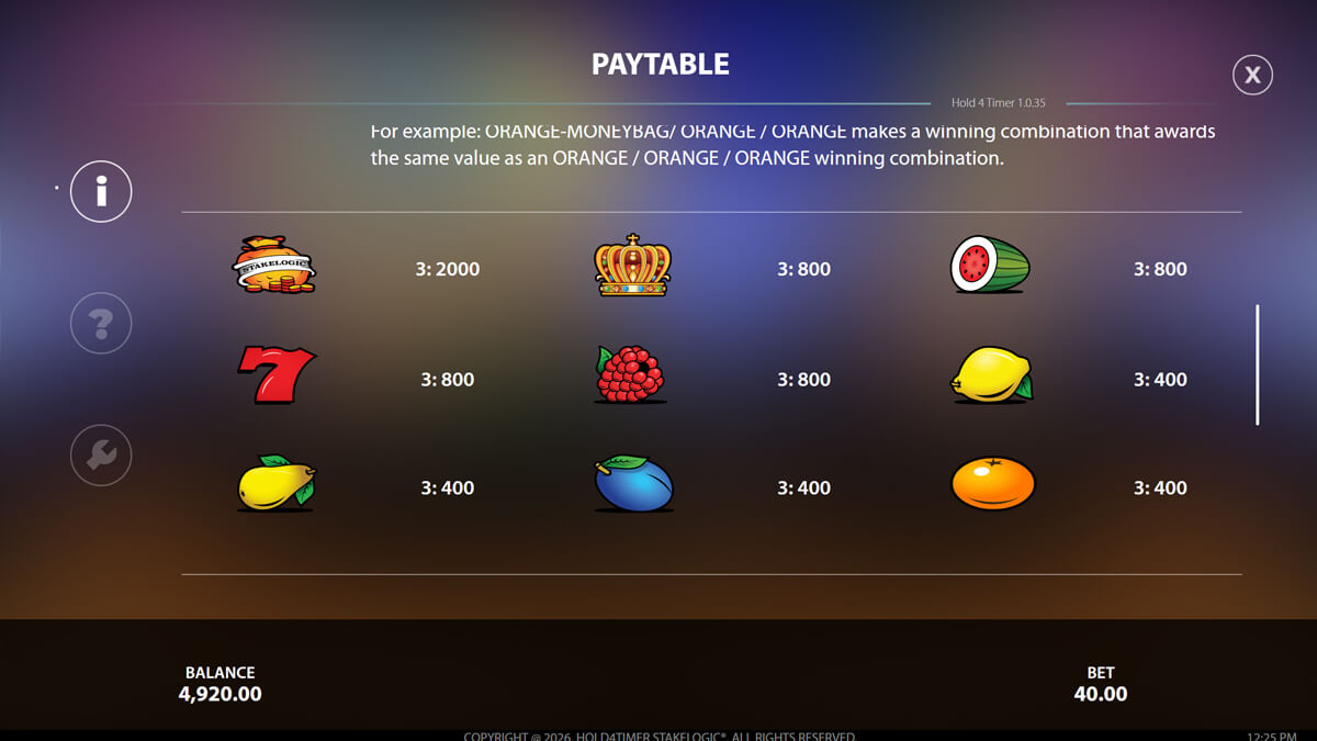 Hold4Timer is part of StakeLogic’s broader Timer line of classic inspired slots, sharing visual language and structural philosophy with related titles. While it introduces its own Hold mechanic twist, it is not a reskin of a specific predecessor. Instead, it functions as a thematic and mechanical variation within an established family of low volatility fruit slots rather than a direct clone.