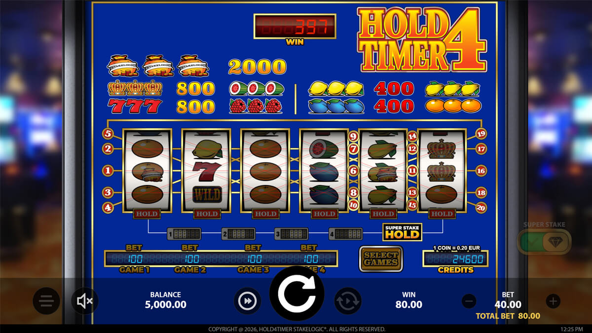 Hold4Timer by StakeLogic is a low volatility, classic style video slot engineered for frequent interaction rather than high payout extremes. Built on a compact 3×3 grid with five fixed paylines, the game emphasizes repetition, reel locking behavior, and incremental wins through its Super Stake enabled Hold feature. The mathematical design favors steady bankroll circulation, frequent small outcomes, and a capped exposure ceiling, aligning the experience with traditional fruit machine dynamics rather than modern high variance slot expectations.