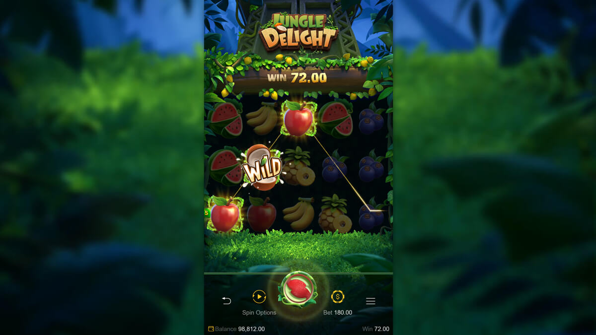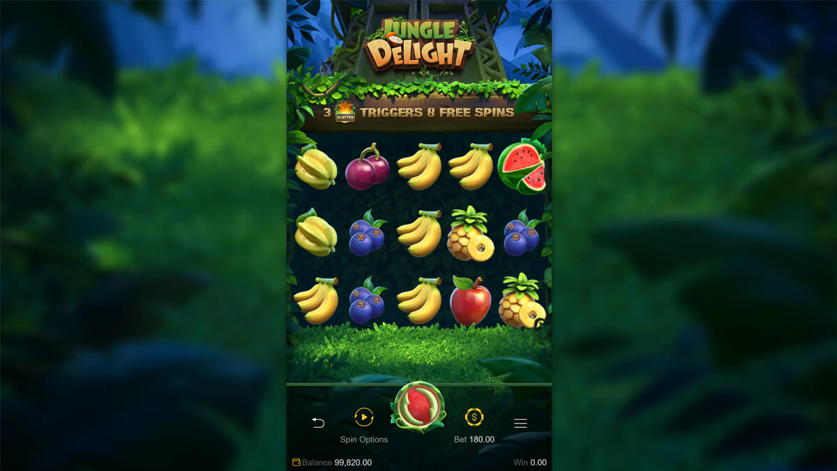 The base configuration of Jungle Delight adheres to a conventional 5×3 structure supported by 20 paylines. The symbol set is fruit-dominant, including watermelons, bananas, pineapples, cherries, and blueberries, complemented by Wilds and Scatters. The Wilds substitute for all standard symbols and appear only on reels 2, 3, and 4, maintaining grid balance without overwhelming base outcomes. Payout intervals remain frequent enough to sustain rhythm but low enough to allow anticipation of feature activation.