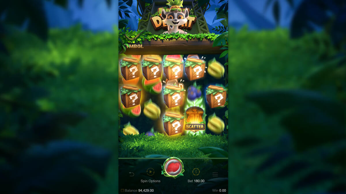 Visually, the game adopts a lush jungle theme dominated by bright fruit symbols and a cheerful lemur mascot that anchors the aesthetic. The background features a moss-covered temple structure surrounded by vegetation, while animations and transitions maintain a fluid rhythm. Symbols include various tropical fruits and thematic icons that fit the visual logic of the setting. Mechanically, the slot focuses on a streamlined feature suite: Wild substitutions, random Mystery Boxes, and a Free Spins mode using sticky symbols to extend cumulative win sequences. This minimalism promotes fluid play without cognitive overload.