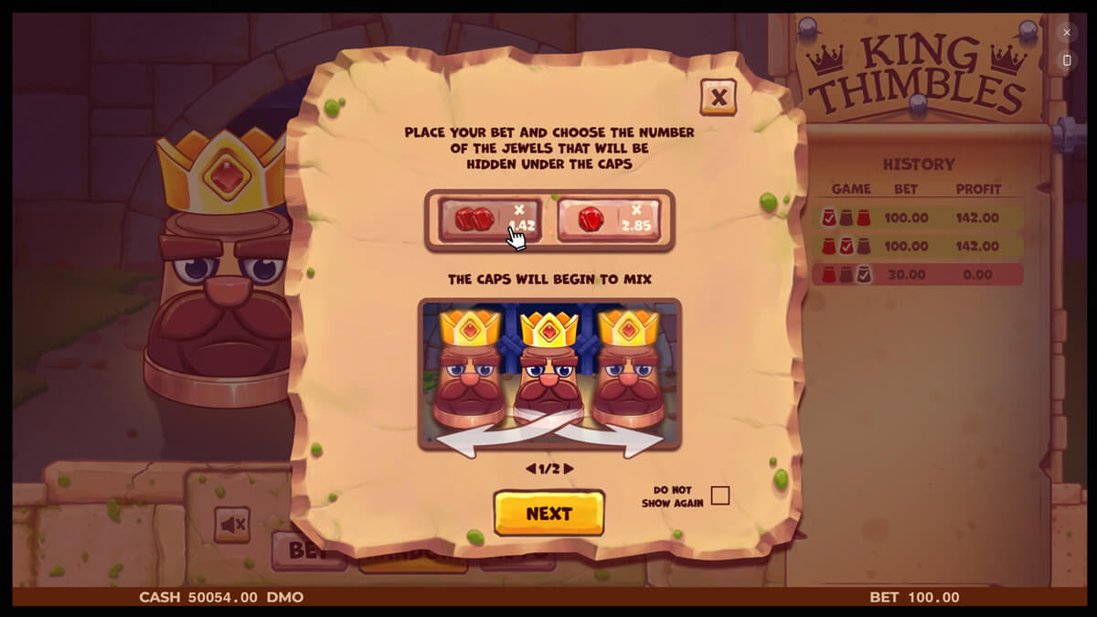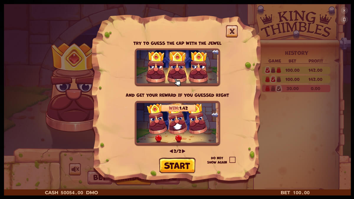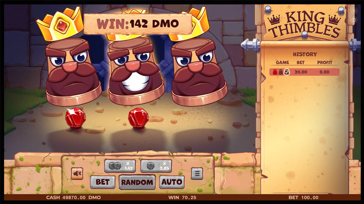 The visual presentation blends castles, crowns, and animated thimbles that act as both thematic anchors and interactive elements. Symbols are minimal by design, with gameplay focused entirely on choosing correctly rather than triggering features. The experience is intentionally short loop, favoring quick engagement cycles over extended sessions.