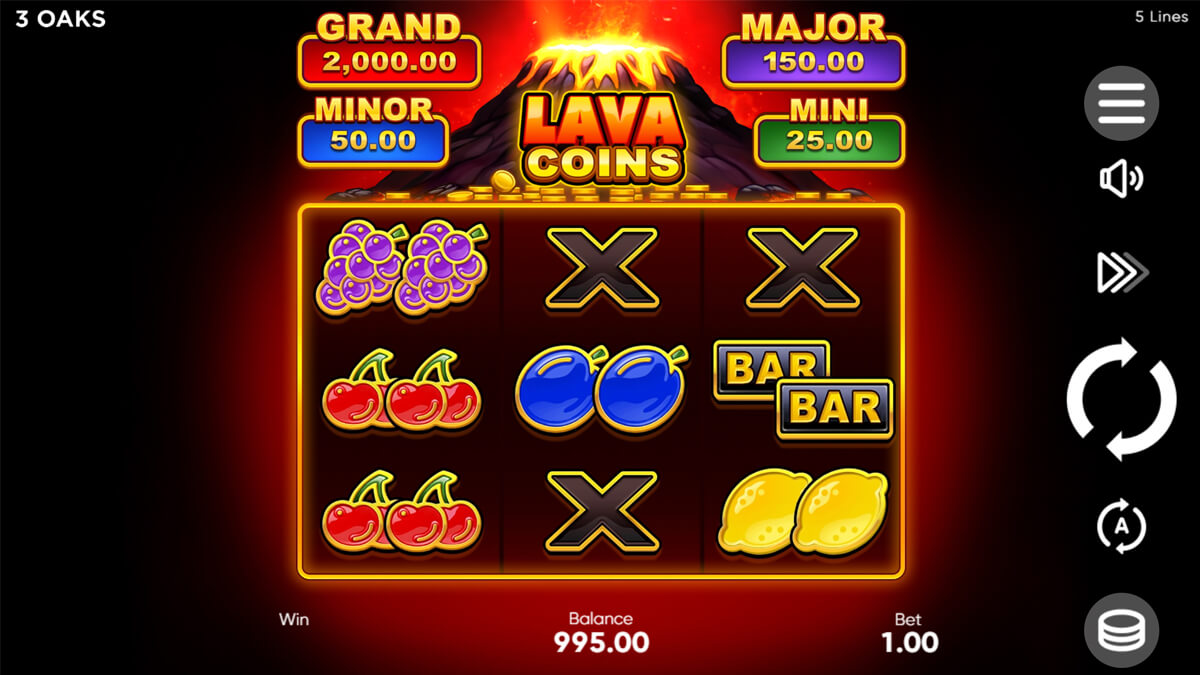 Lava Coins represents the original entry in what later became a recognizable internal series for 3 Oaks. It is not a reskin, as its reel structure, symbol economy, and energy collection mechanic are purpose built rather than adapted from another title. While it shares thematic elements with other coin based Hold and Win slots on the market, its compact 3-3 layout and five line configuration differentiate it structurally.