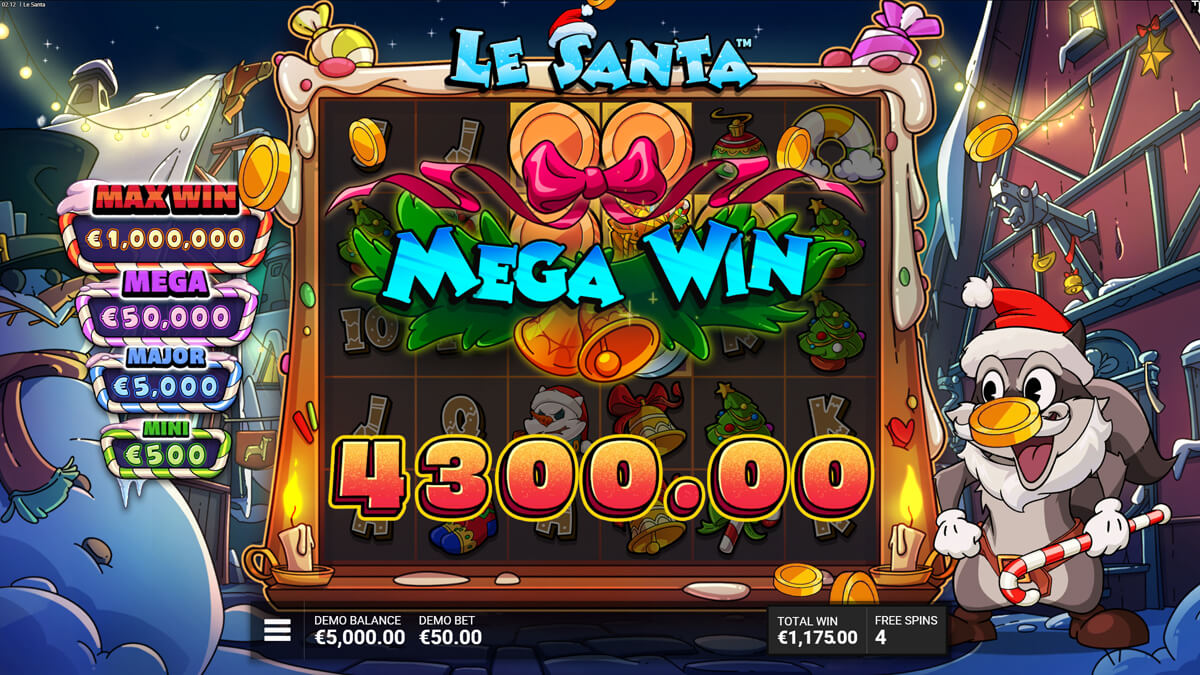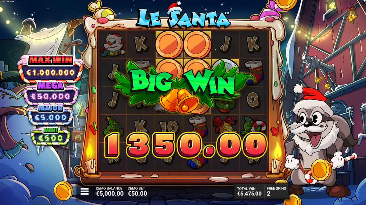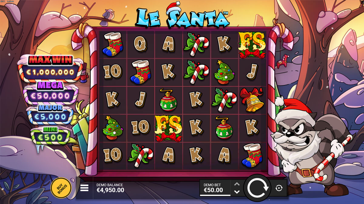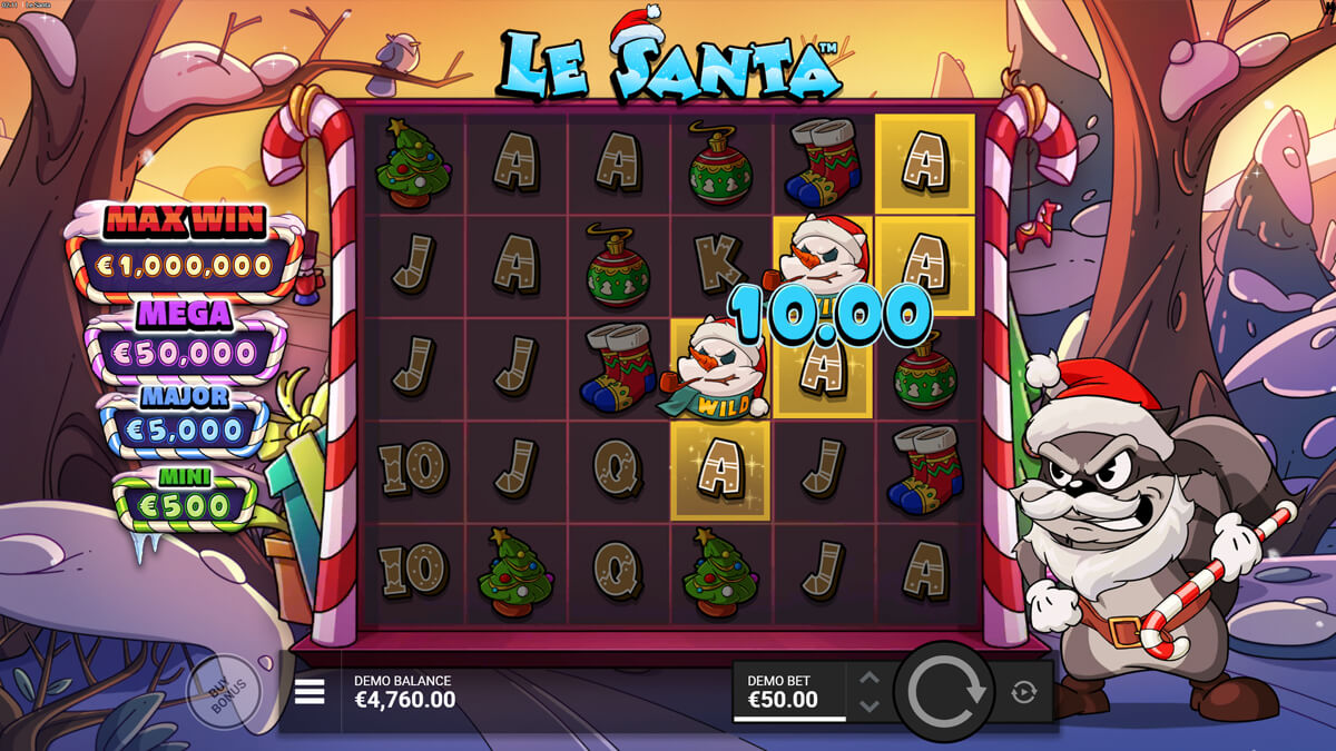 In the base game, Le Santa operates on a 6-reel, 5-row cluster pays layout. Wins occur when five or more identical symbols connect horizontally or vertically. Each winning cluster triggers a cascade: symbols disappear, dropping new ones into place, enabling potential chain reactions. Standard symbols include low-pay card ranks (10-A) and premium festive icons such as stockings, baubles, candy-canes and bells.