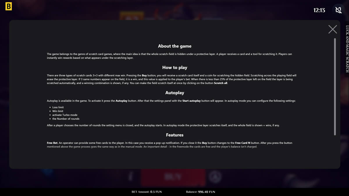 BGAMING frequently explores alternative casino formats alongside traditional slots, and Luck & Magic Scratch reflects a deliberate shift toward instant win products. Their approach prioritizes visual feedback, clarity, and fast resolution over mathematical complexity. The reduced RTP is typical for scratch style games and aligns with industry standards rather than slot benchmarks.