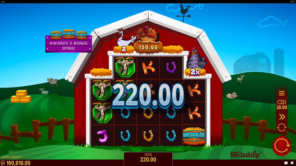 The presentation leans heavily into animated farm chaos, with chickens, corn, and animal symbols constantly interacting with the grid. Gameplay is dominated by BIG BuildUp activations, reel expanding wilds, and the Raise the Roof bonus, resulting in sessions that feel mechanically busy and progression oriented rather than outcome focused.