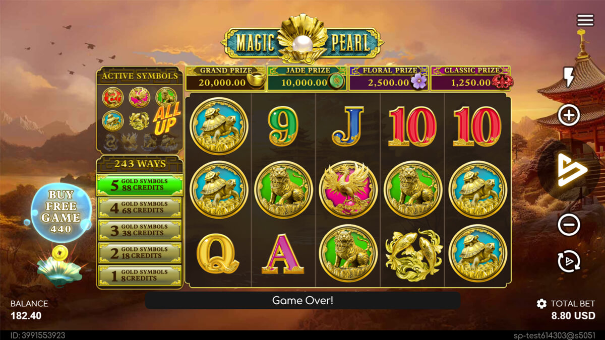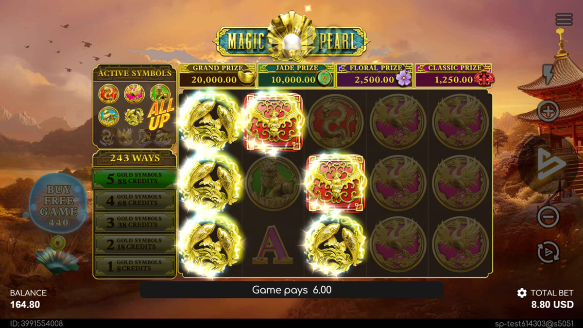 Magic Pearl is presented on a 5×3 reel matrix with 243 ways to win, eliminating fixed paylines in favor of adjacent symbol matching across reels. The RTP is set at 96.24 percent with a declared high volatility profile. While the maximum win is not officially disclosed, the presence of a Grand Prize linked to full reel occupation and layered multipliers suggests a substantial upper ceiling. The betting spectrum ranges from 4.4 to 176, placing the slot in a medium to high stake category.