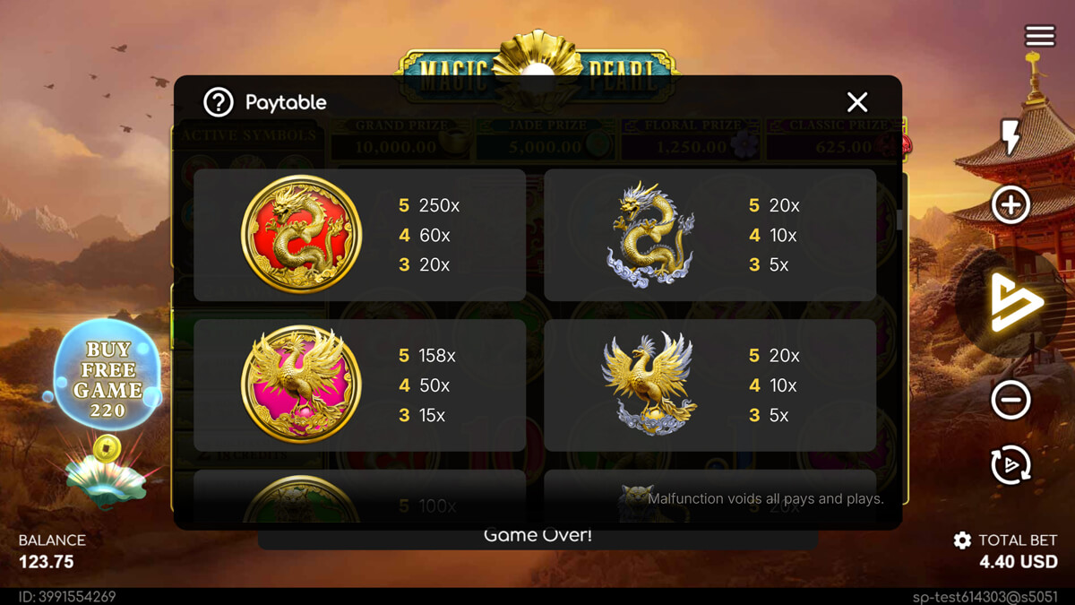 The theme centers on Oriental mythology, incorporating dragons, phoenixes, koi fish, turtles, and symbolic pearls rendered in gold and jade hues. Visual composition emphasizes luminous coins and shell elements that house pick rewards. Core gameplay revolves around escalating feature potential through Gold Symbol collection and random Magic Prize activations. The Top Up Free Game mode introduces sticky Yellow and Green Coins that lock and accumulate value, reinforcing the slot’s high risk, high reward orientation.